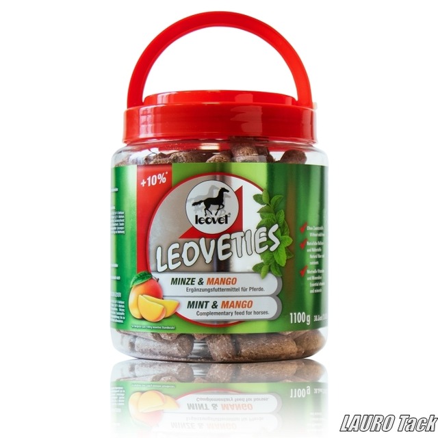 Leoveties ミント&マンゴーは、 自然由来の食物繊維やビタミン、ミネラルを含んだおやつです。 ミントのさわやかさとマンゴーの甘みを組み合わせた、 馬が喜んで食べてくれる味わいが特長です。 毎日のごほうびや、ちょっとしたコミュニケーションにも使いやすく、 内容量はたっぷり1100g。 使い終わったあとも活用しやすい、 繰り返し使える保存容器に入っています。