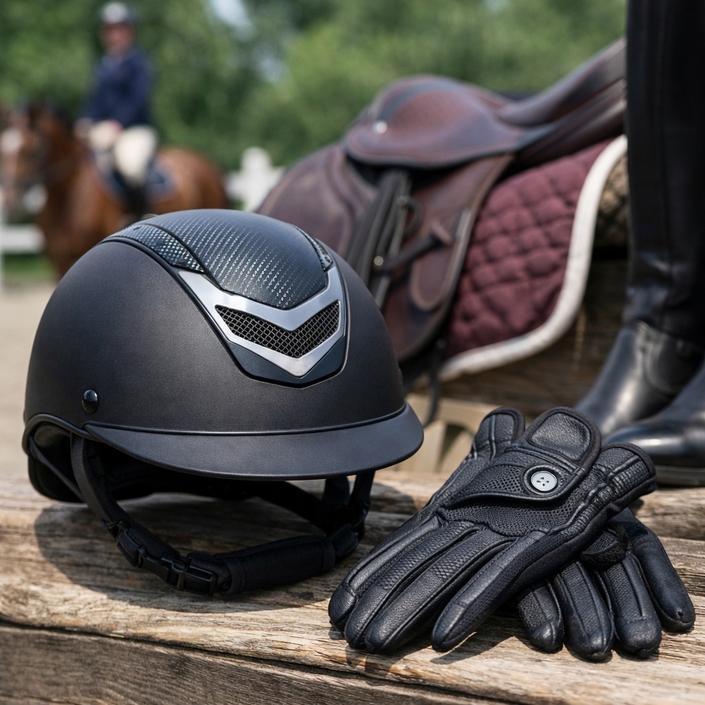 乗馬グローブ、乗馬ヘルメット、ゼッケンなどの乗馬用品は