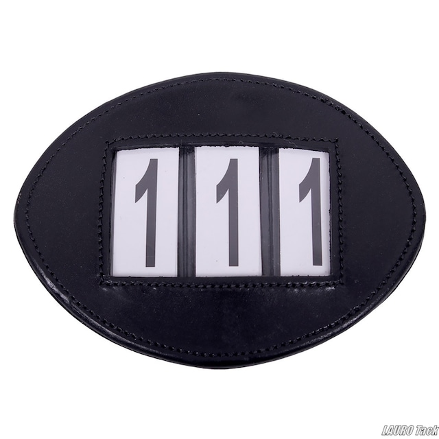 QHPのベーシックなレザー製ナンバーホルダー。面ファスナーまたは安全ピンで装着可能。楕円形デザインで、差し替え式3桁番号付き。2個セット。サイズ12×9cm。 [0]