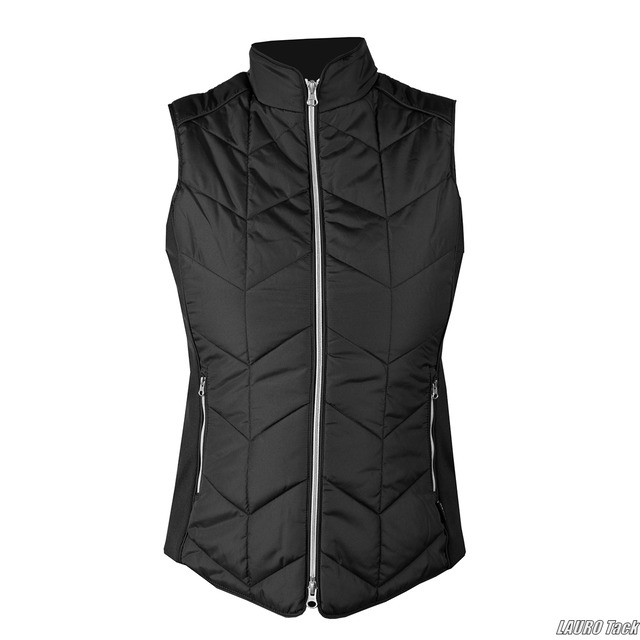 女性らしいラインを引き立てる、着心地の良いボディウォーマーです。体にフィットしやすいシルエットで、動きやすさにも配慮されています。サイドにはリブ素材を使用し、騎乗時も快適。上下開閉可能な2wayファスナーとフロントのファスナーポケット付き。中綿入りで、日常使いから厩舎作業まで幅広く活躍します。 [0]