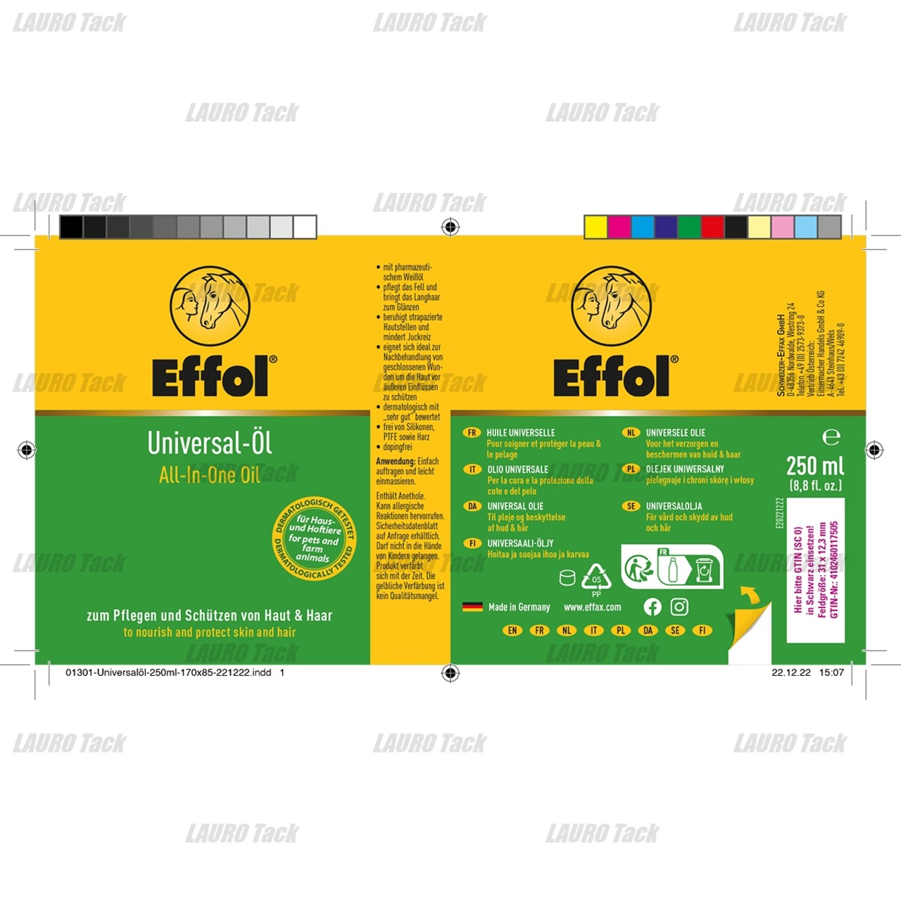 Effol All-In-One Oilは、馬の毛に輝きを与え、皮膚と毛を保護し、敏感な部分を迅速かつ効果的に和らげます。このオールインワンオイルは皮膚科的に認められており、閉じた傷の治療後に使用するのに非常に適しており、外部からの影響から皮膚を保護します。