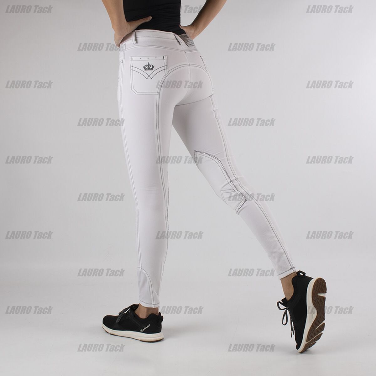 清潔感のあるホワイトにラインストーンの輝きが映える、Epplejeckのキッズ向けキュロット。シリコン製のフルグリップ仕様で鞍とのフィット感を高めつつ、華やかで上品なデザインがレッスンや競技にもぴったりです。