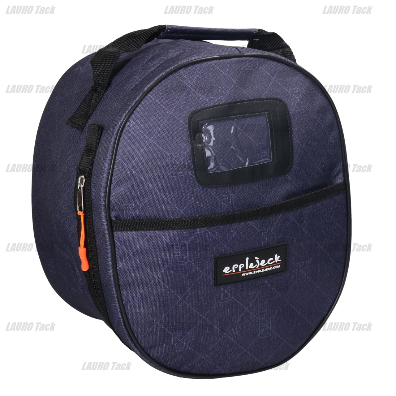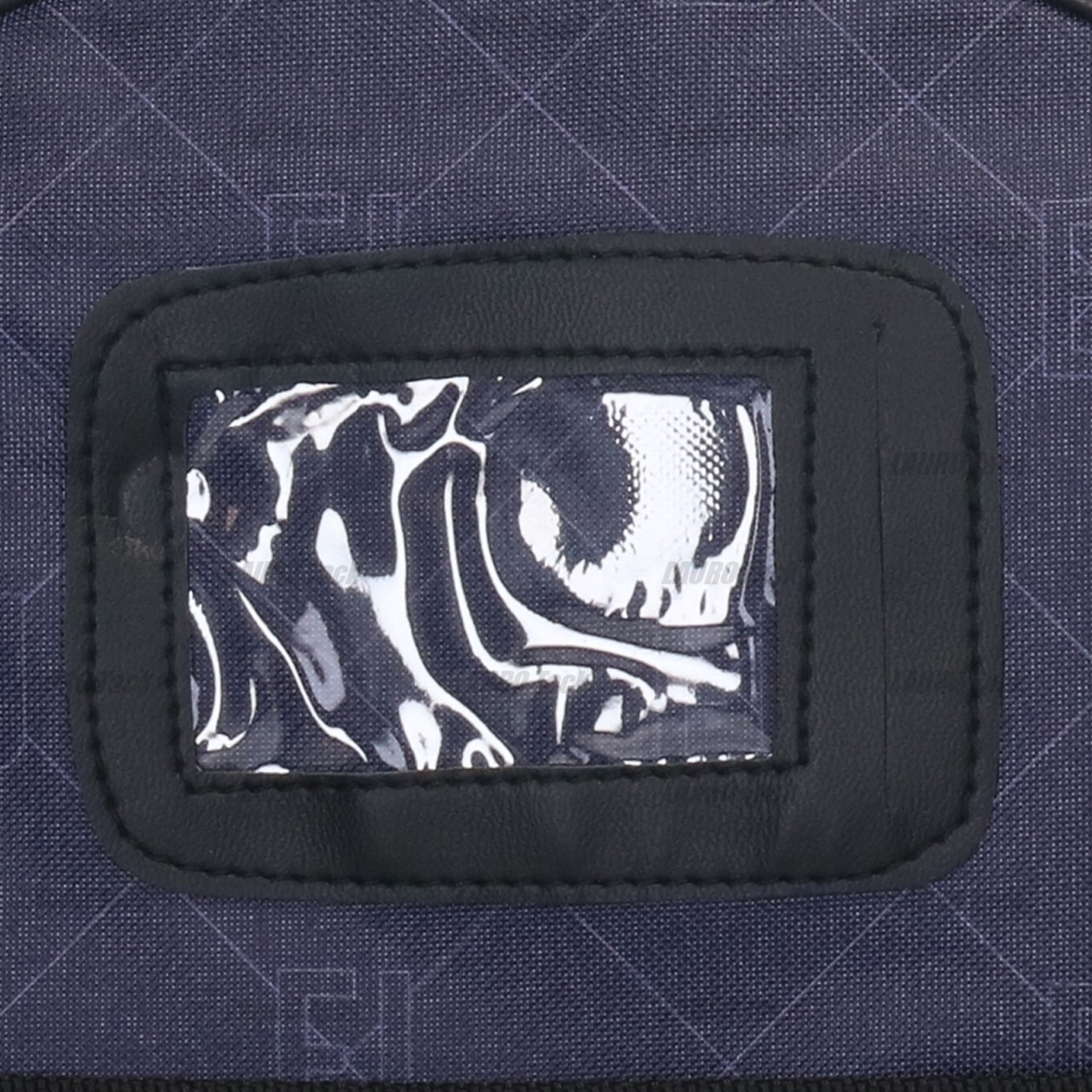 撥水加工の生地を使ったEJプリントのトートバッグ(ダークブルー)。しっかりした底板と底鋲で型崩れを防ぎ、安定して置けます。外側のネームカード用ポケットと底面の名前記入スペース付き。上部にはストラップポケット、ラバー製EJロゴがアクセント。ショルダーストラップ用ループあり(ストラップは付属しません)。