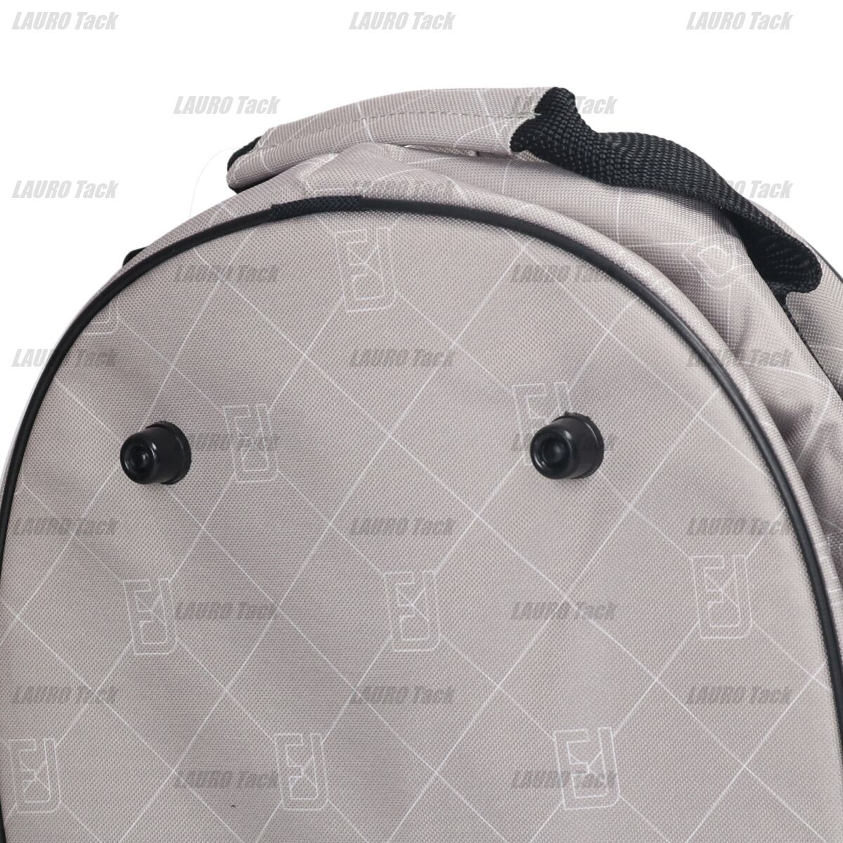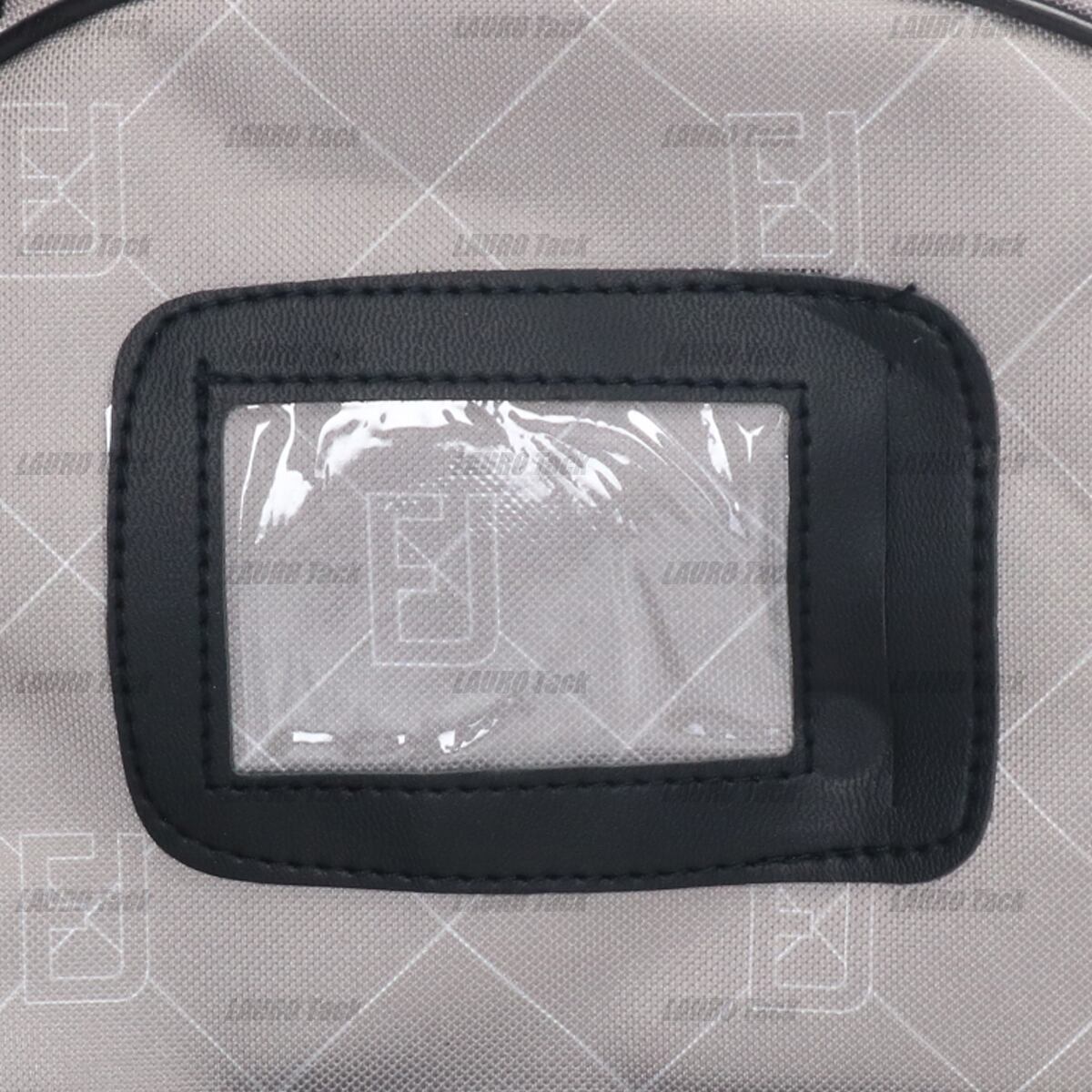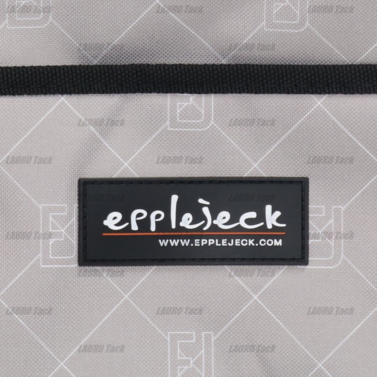 撥水加工の生地を使ったEJプリントのトートバッグ(ベージュ)。荷物を入れても形を保ちやすい底板と底鋲付き。外側のネームカードポケットや底面の名前記入スペース、上部のストラップポケットが実用的。ラバー製EJロゴがワンポイント。ショルダーストラップ用ループあり(ストラップは付属しません)。