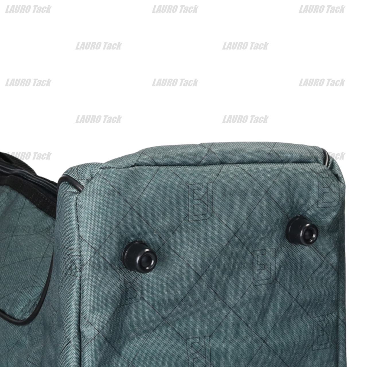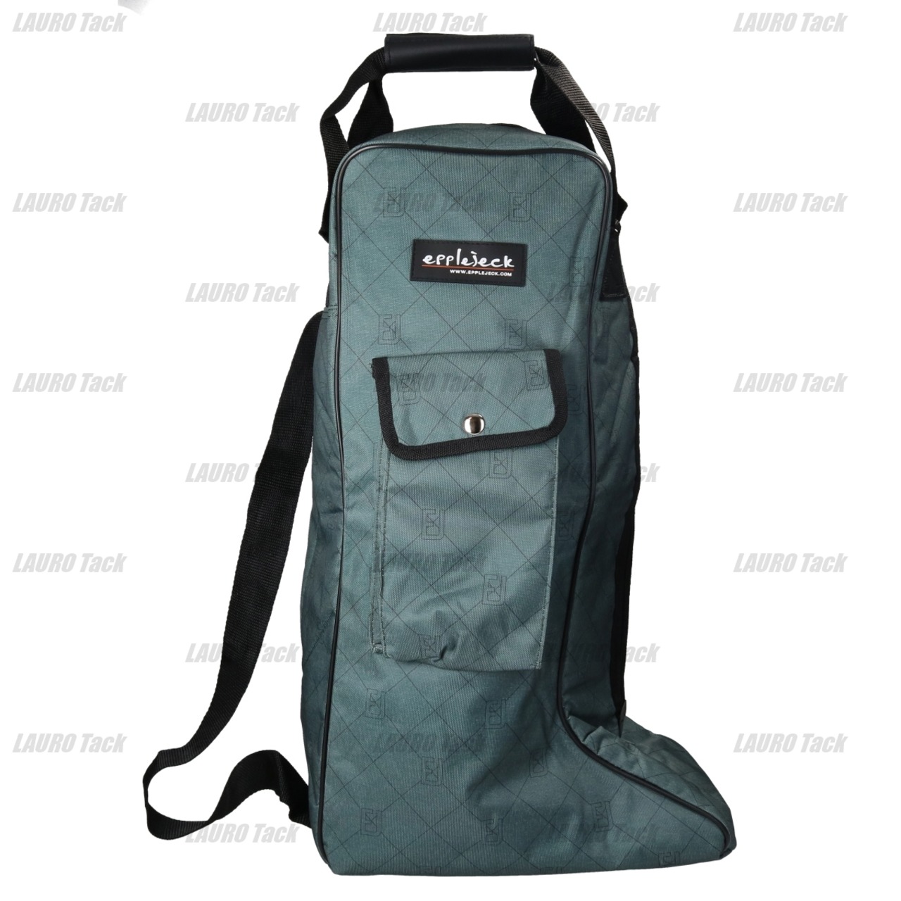 EJPrintedコレクションのブーツバッグ(グリーン)。撥水加工の全面プリント生地で水や汚れを防ぎ、オレンジ引き手付きジッパーで開閉。底鋲付きの底面は安定感があり、面ファスナー連結ハンドルと側面ポケット、ラバー製EJロゴがポイントです。