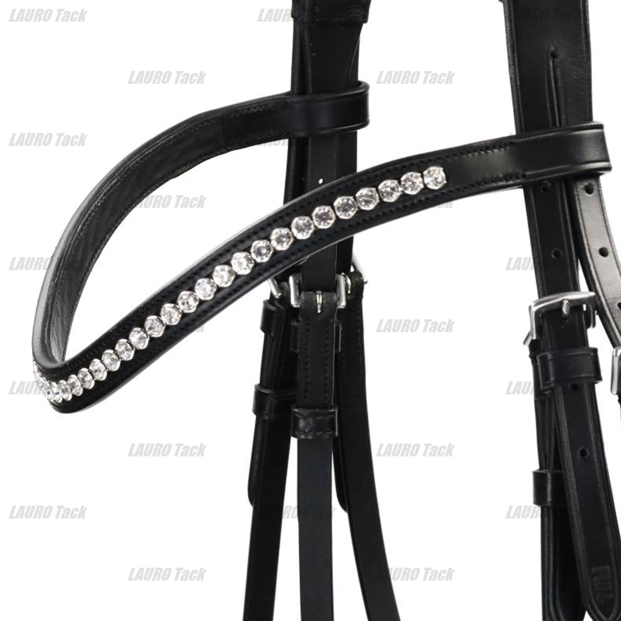 とても柔らかく快適なSKOL製の頭絡。高品質レザーを使用し、馬の頭のラインに沿った形で耳元のスペースを確保。柔らかなレザーパッドが快適さを高めています。鼻革もソフトパッド入りで、着脱可能なカーブ(あご革)を内蔵。美しいクリスタル付きの額革がアクセントになり、同色の手綱が付属します。シルバー色の金具仕様。
