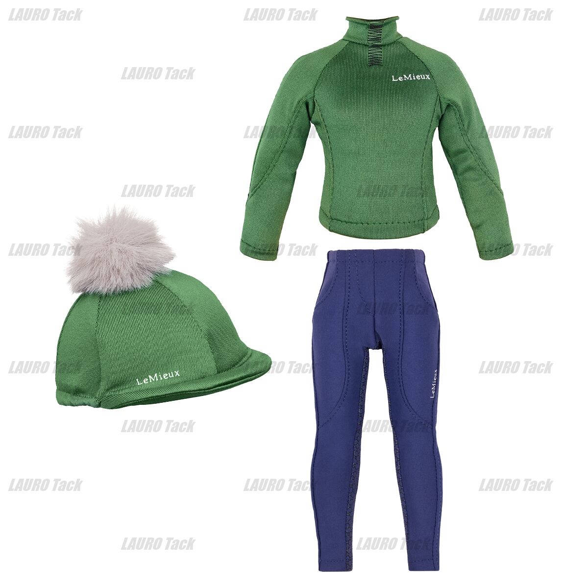 トイライダーの衣装を着せ替えて、トイポニーとコーディネート。ライディングタイツ、トレーニングシャツ、ふわふわポンポン付きキャップカバーの3点セット。落ち着いたグリーンのデザイン。
