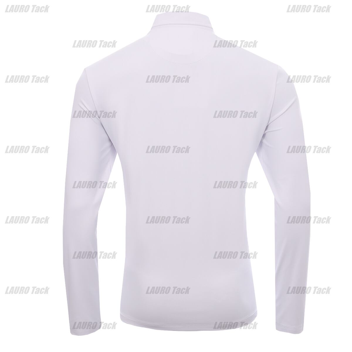 4方向に伸縮する生地を使用した長袖の男性用ショーシャツ。優れた動きやすさと快適性を持ち、クラシックなボタン付き襟とストックタイを固定できるループ付き。素材はポリエステル83%、エラスタン(伸縮性のある合成繊維)17%。