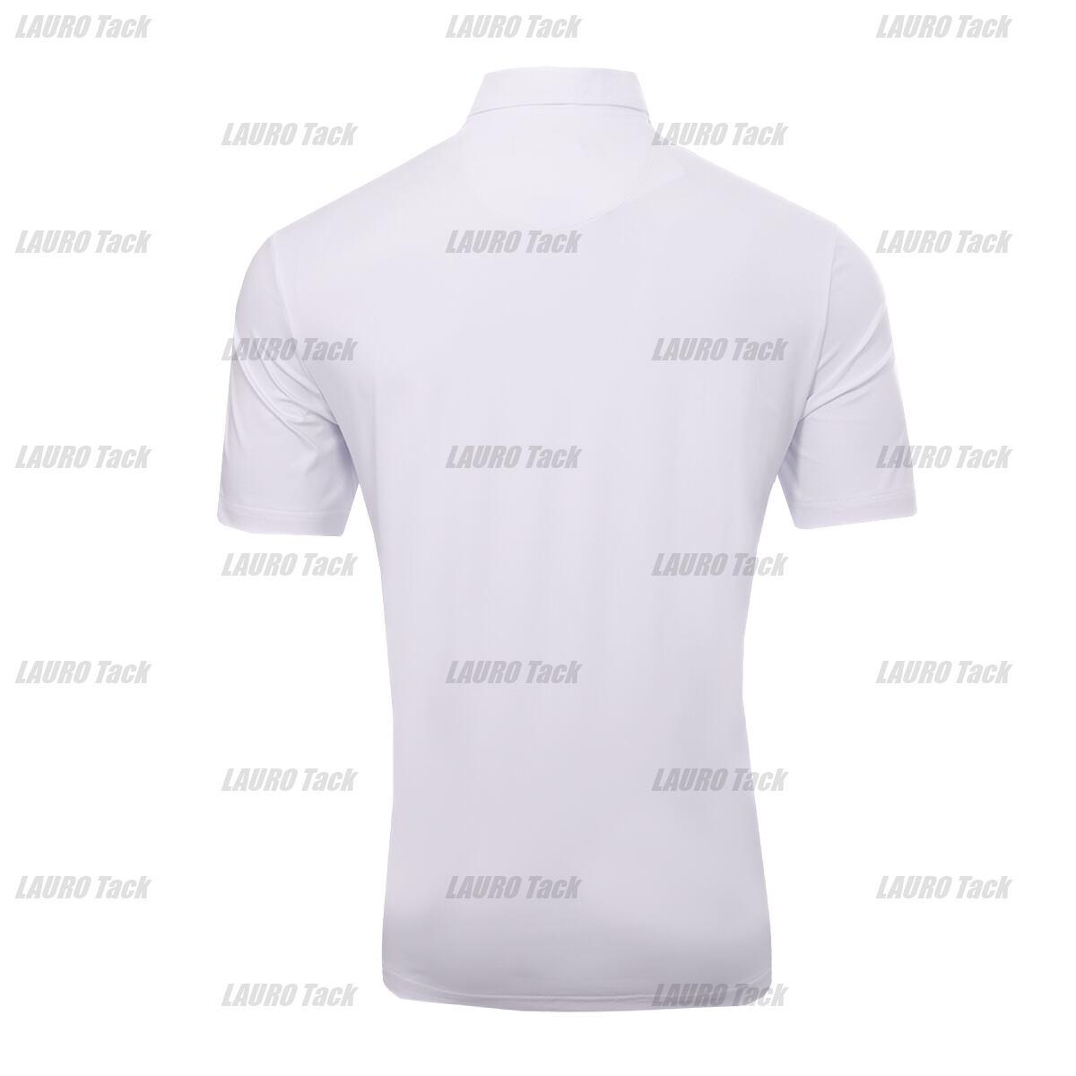 4方向に伸縮する生地を使用した半袖の男性用ショーシャツ。優れた動きやすさと快適性を持ち、クラシックなボタン付き襟とストックタイを固定できるループ付き。素材はポリエステル83%、エラスタン(伸縮性のある合成繊維)17%。