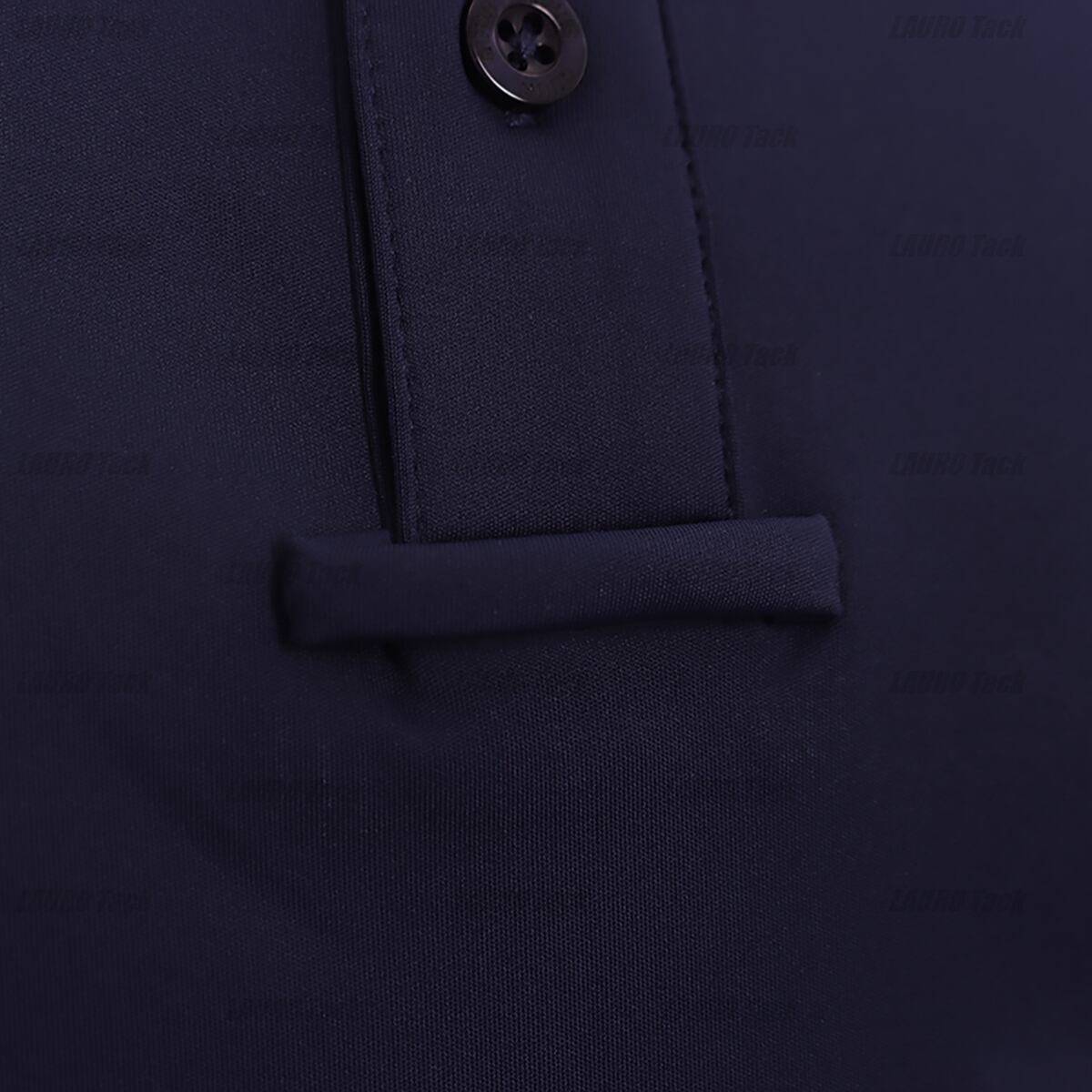 4方向に伸縮する生地を使用した半袖の男性用ショーシャツ。優れた動きやすさと快適性を持ち、クラシックなボタン付き襟とストックタイを固定できるループ付き。素材はポリエステル83%、エラスタン(伸縮性のある合成繊維)17%。