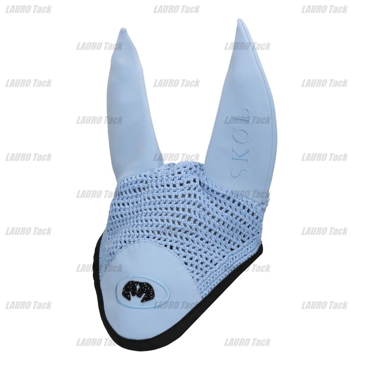 スタイリッシュなSKOLブランドの美しいイヤーネット。丈夫なかぎ編み部分と、額部分に輝くラインストーンをあしらった同色の生地を組み合わせています。耳部分は防音素材で作られており、周囲に気を取られやすい馬の集中力を高めるのに最適です。虫除け効果もあります。