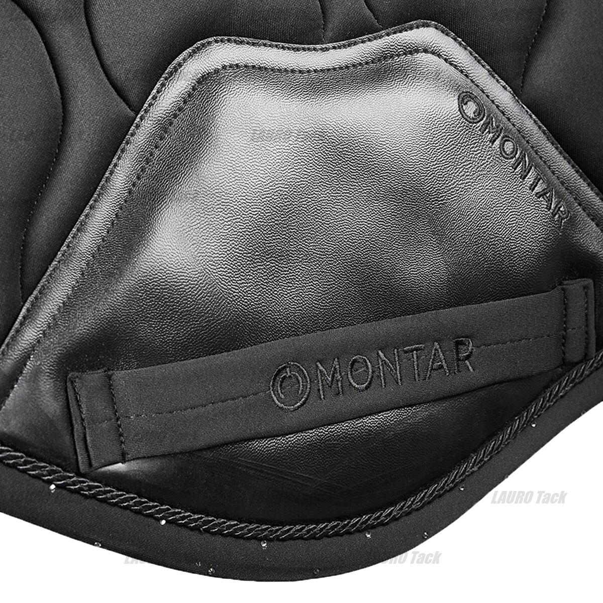 Montar MOFlowシリーズの障害用ゼッケン。ブラックベースにさりげないラインストーン装飾が華やかさを添えます。通気性・吸湿性に優れた素材と高いクッション性で、激しいジャンピング運動でも快適さを保ちます。耐久性も高く、練習や競技での繰り返し使用に最適です。