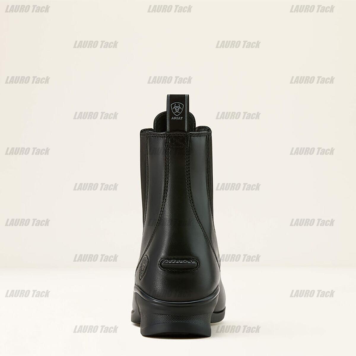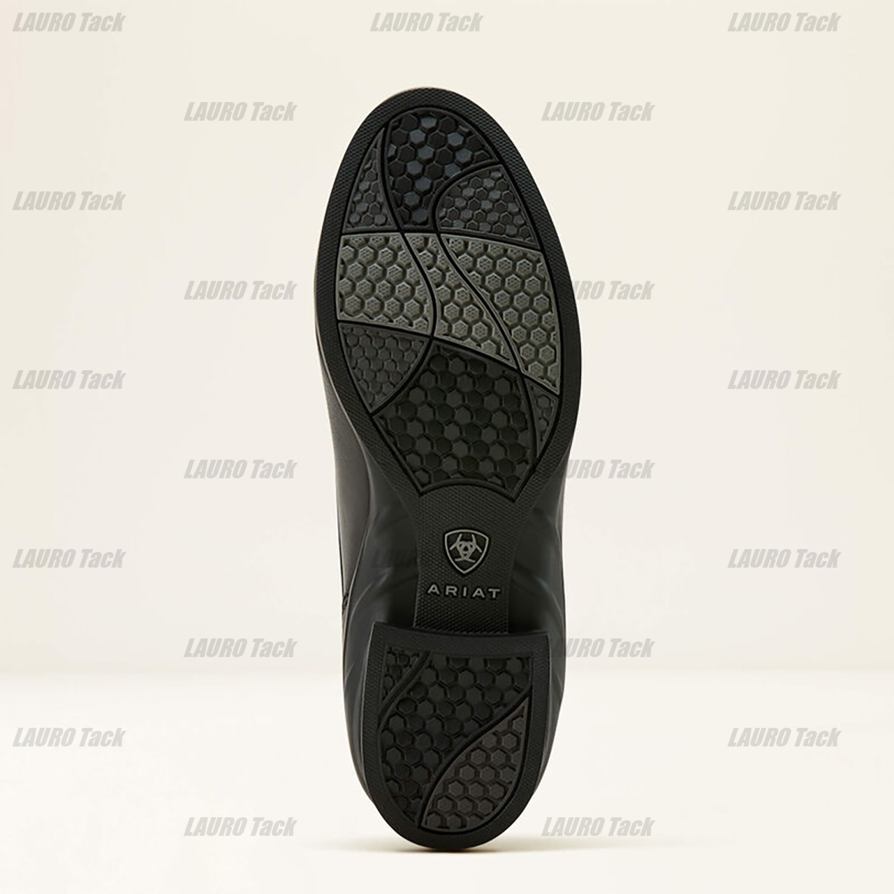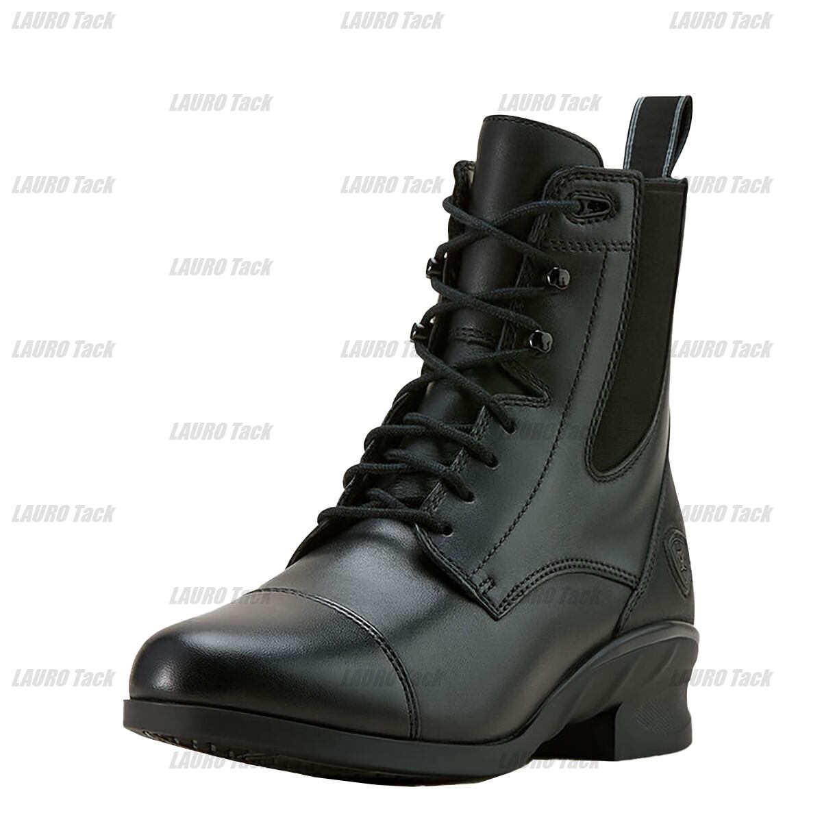 ARIATのブラックパドックレースジョッパーブーツ。高品質レザーを使用し、丈夫で快適な履き心地を提供。優れたグリップ力で馬場作業や軽い乗馬に適し、クラシックなデザインでどんな装いにも合わせやすいです。