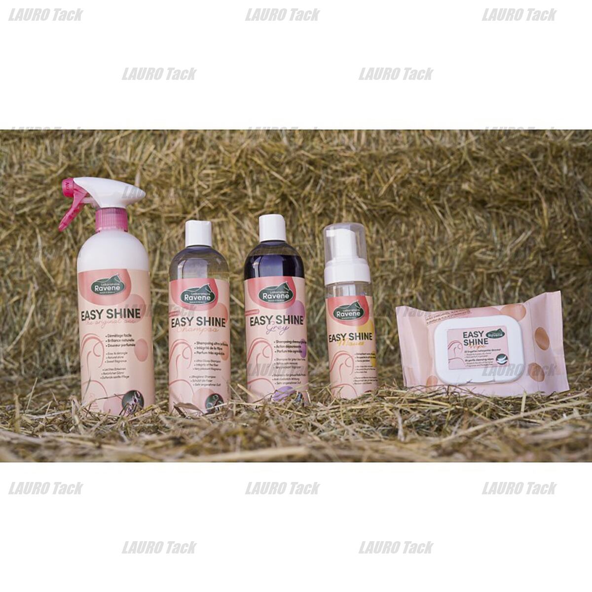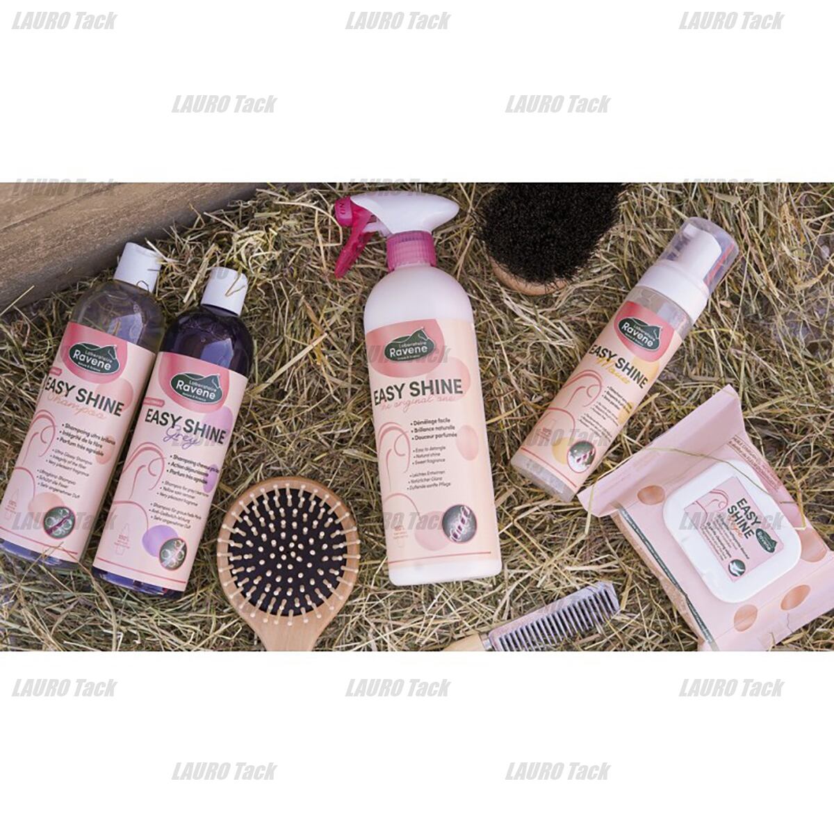 Ravene の「Easy Shine」は、グレーや明るい毛色にぴったりのマイルドシャンプー。汚れをやさしく落とし、毛並みに自然なツヤを与えます。普段のお手入れに安心して使えるだけでなく、競技前に毛並みをより美しく見せたいときにも最適です。