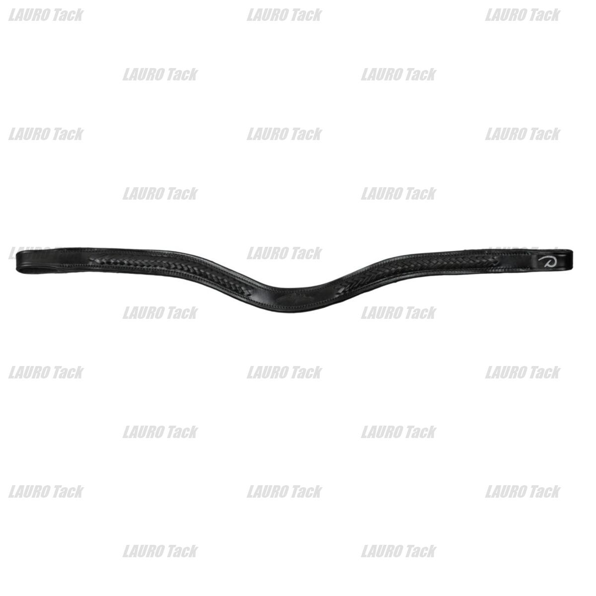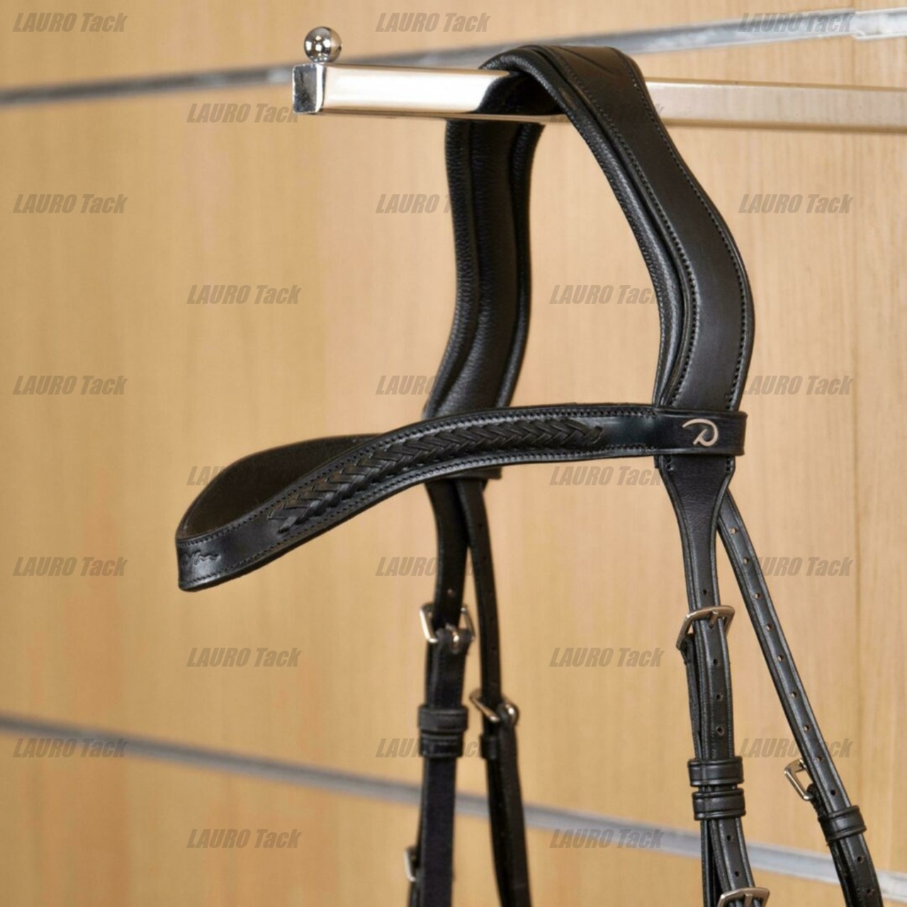 レース模様のような装飾が特徴的なV字型デザインの額革(ブラック)。繊細で華やかな雰囲気を持ち、馬の顔をエレガントに演出します。高品質なレザーを使用し、快適さと耐久性を両立。競技会で人目を引きたいライダーにおすすめのデザイン性豊かな一本です。