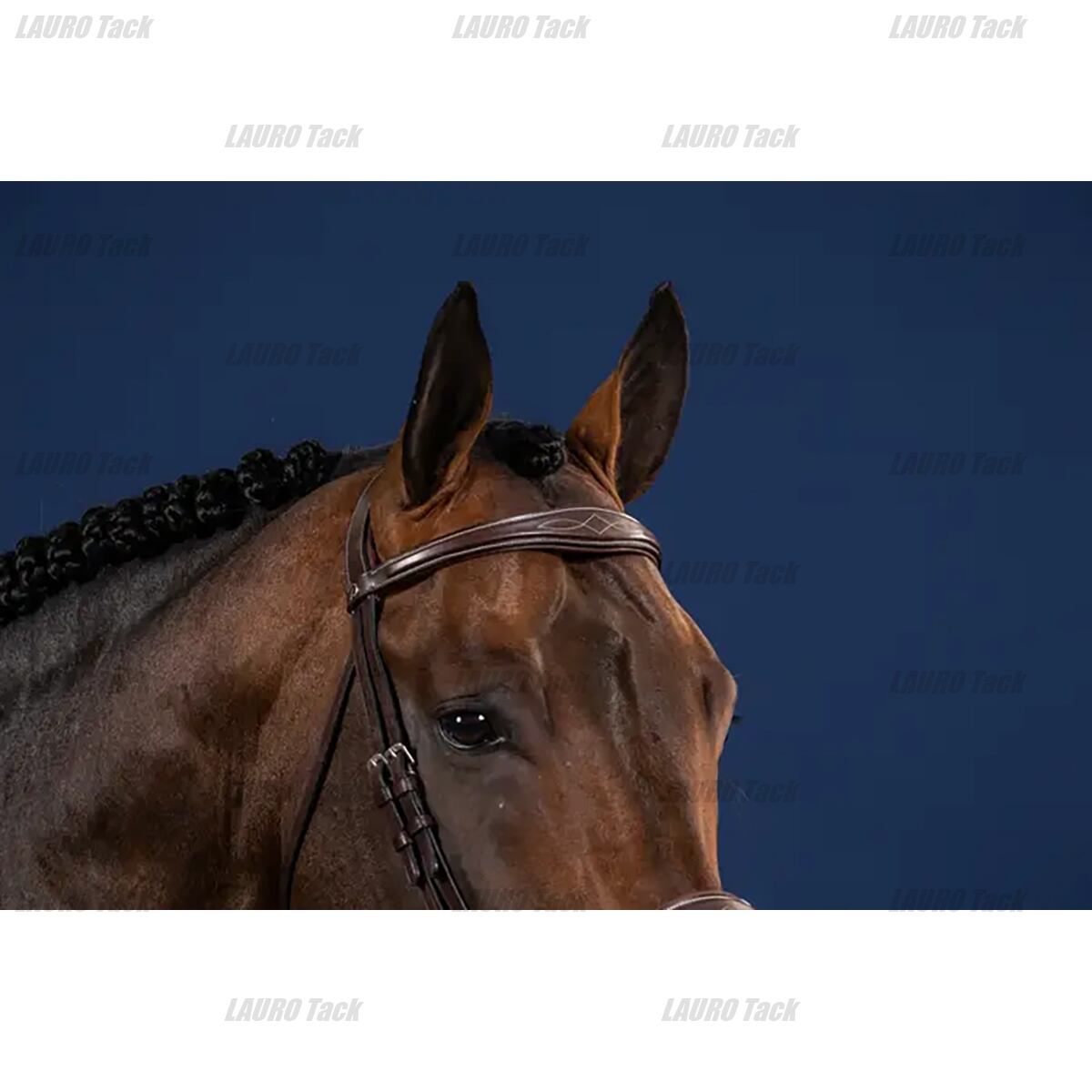 ブラウンレザーを使用した快適性重視の額革。馬の額に自然に沿う形で作られており、長時間の装着でもやさしいフィット感が続きます。クラシカルな色合いとモダンな設計が調和し、日常使いにも競技会にも適した高機能な一本です。