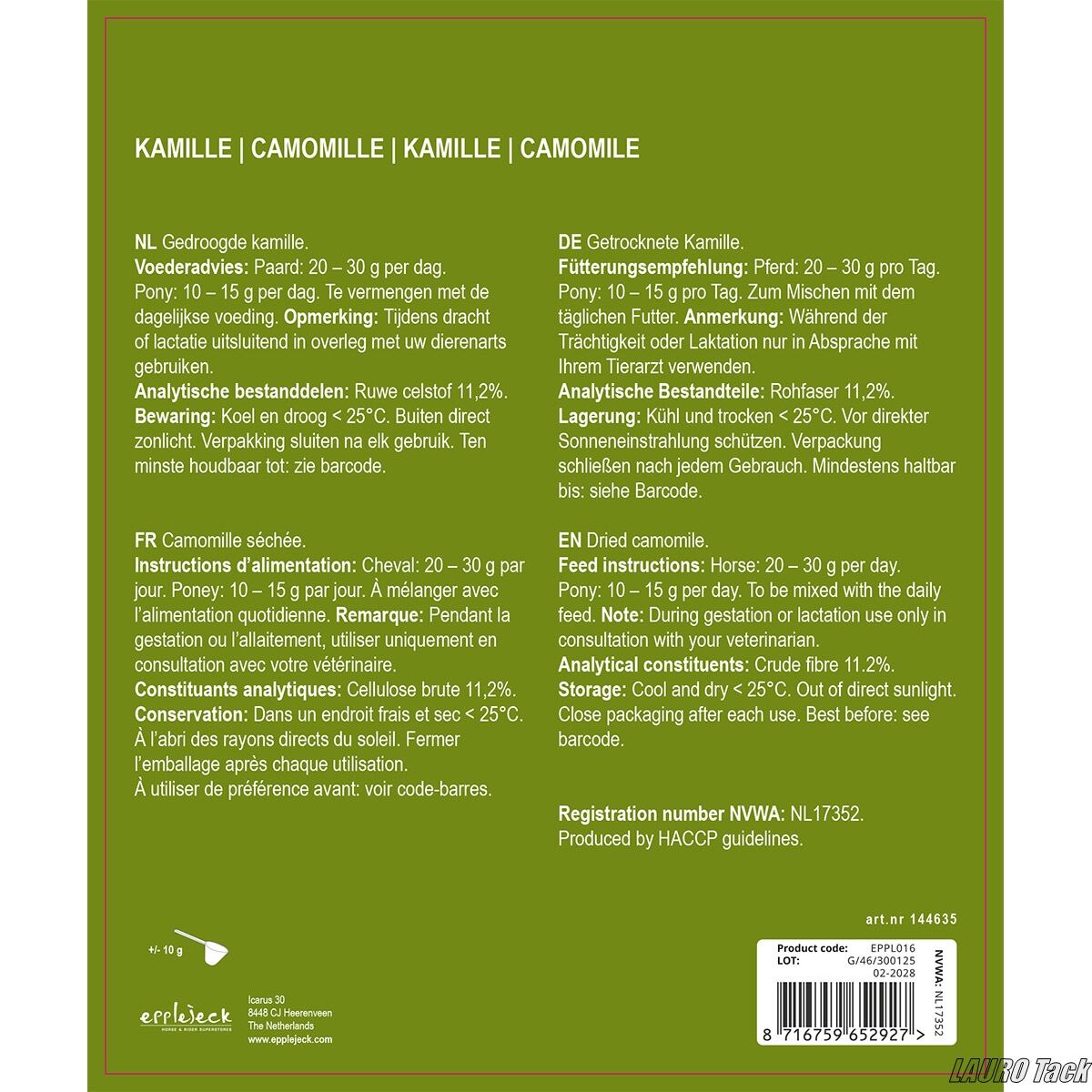 Epplejeckのカモミールサプリメント。馬のための補助飼料で、消化や胃腸の働きを助け、リラックス効果をサポートします。毎日の健康維持に役立ち、落ち着きを促すケアとしても適しています。