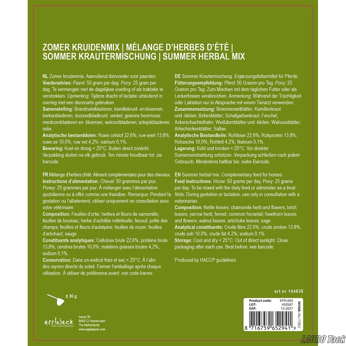 EpplejeckのSummer Herb Mix。暑い季節に馬の持久力をサポートする補助飼料です。消化を助け、夏場の健康維持に役立ちます。