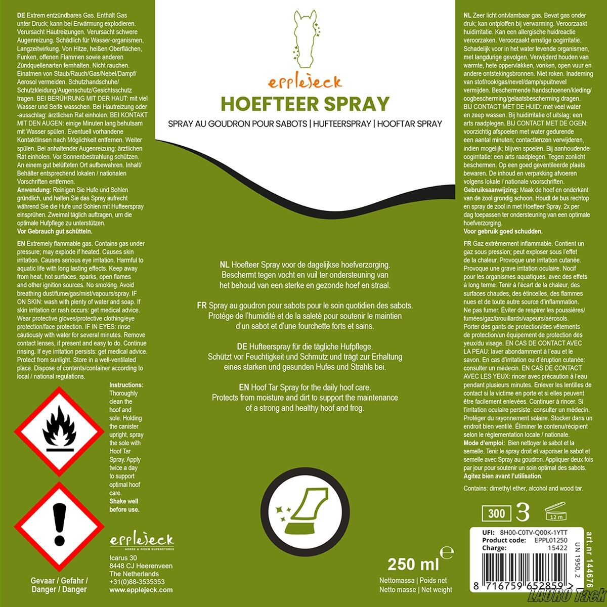 EpplejeckのHoof Oil Spray。毎日の蹄ケアに適しており、敏感で柔らかい蹄を保護します。スプレー式で簡単に塗布でき、保護膜を形成して蹄を健やかに維持します。