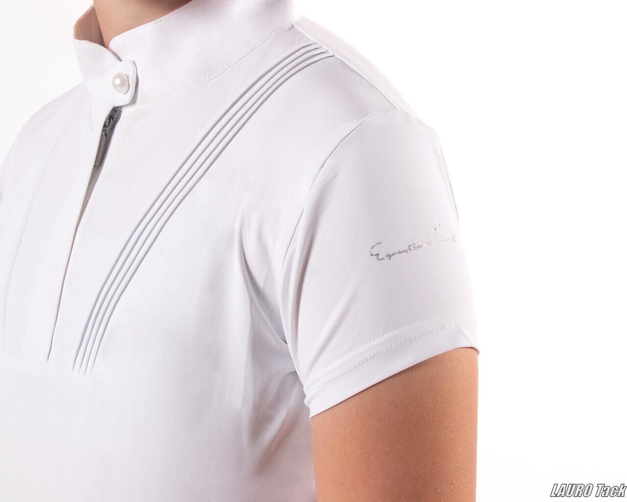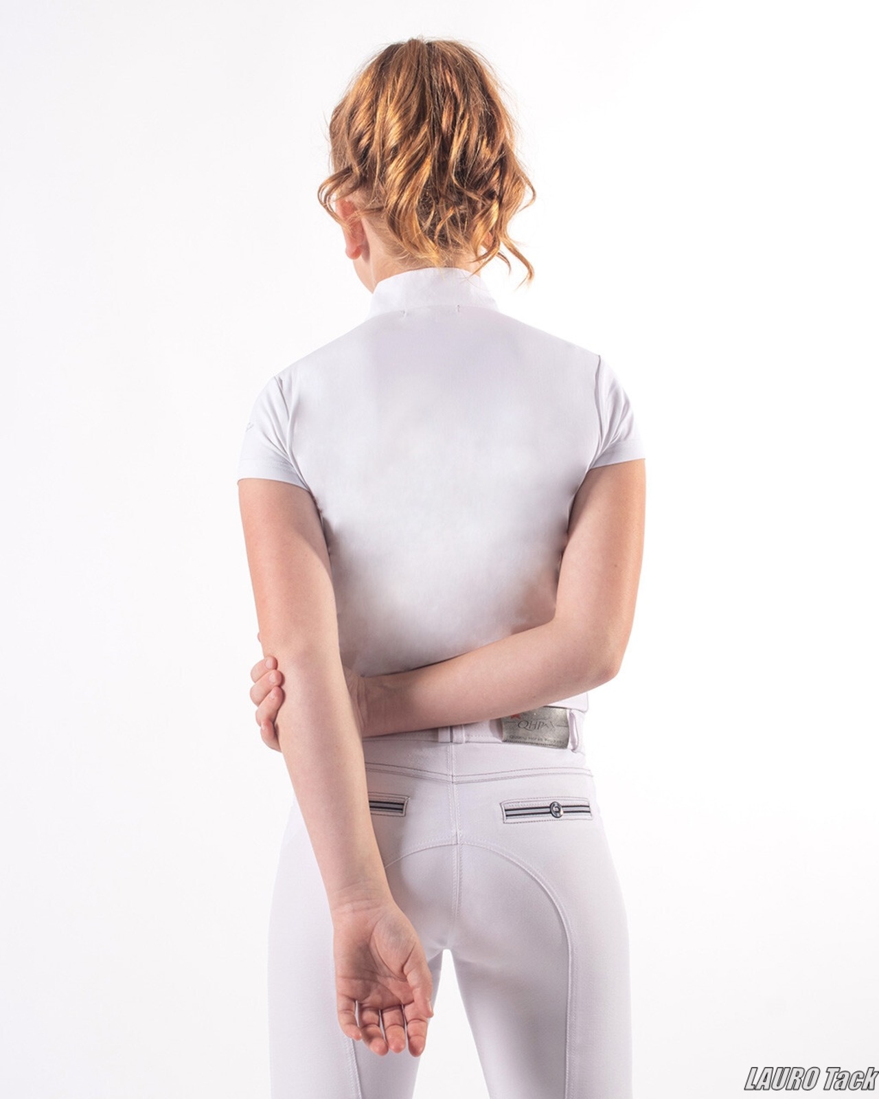 QHPのキッズ用コンペティションシャツ。柔らかく快適な素材を使用。襟と前立てに美しいレースのディテールがあり、エレガントで特別感のあるデザインです。競技会で華やかさを演出しながら快適に着用できます。