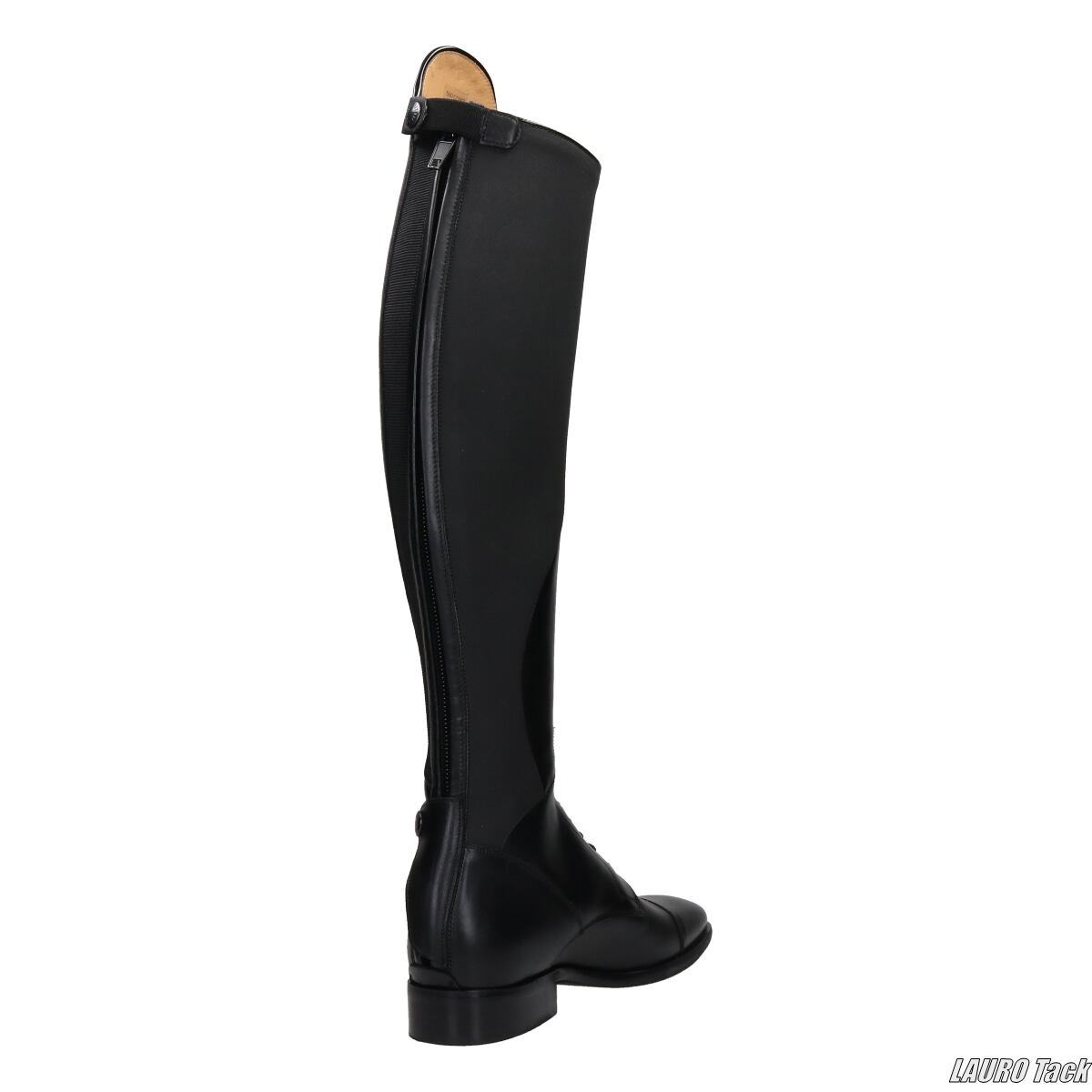 PetrieのNapoli長靴。ハイカットのドレッサージュスタイルで、スタイリッシュかつエレガント。耐久性のある高品質レザーと光沢のあるパテント素材の組み合わせで、クラシックな外観を持ちながら特別感を演出します。スターダストチェックのディテールがユニークなアクセント。優れた快適性を提供し、長時間の騎乗でも快適に過ごせるよう設計されています。