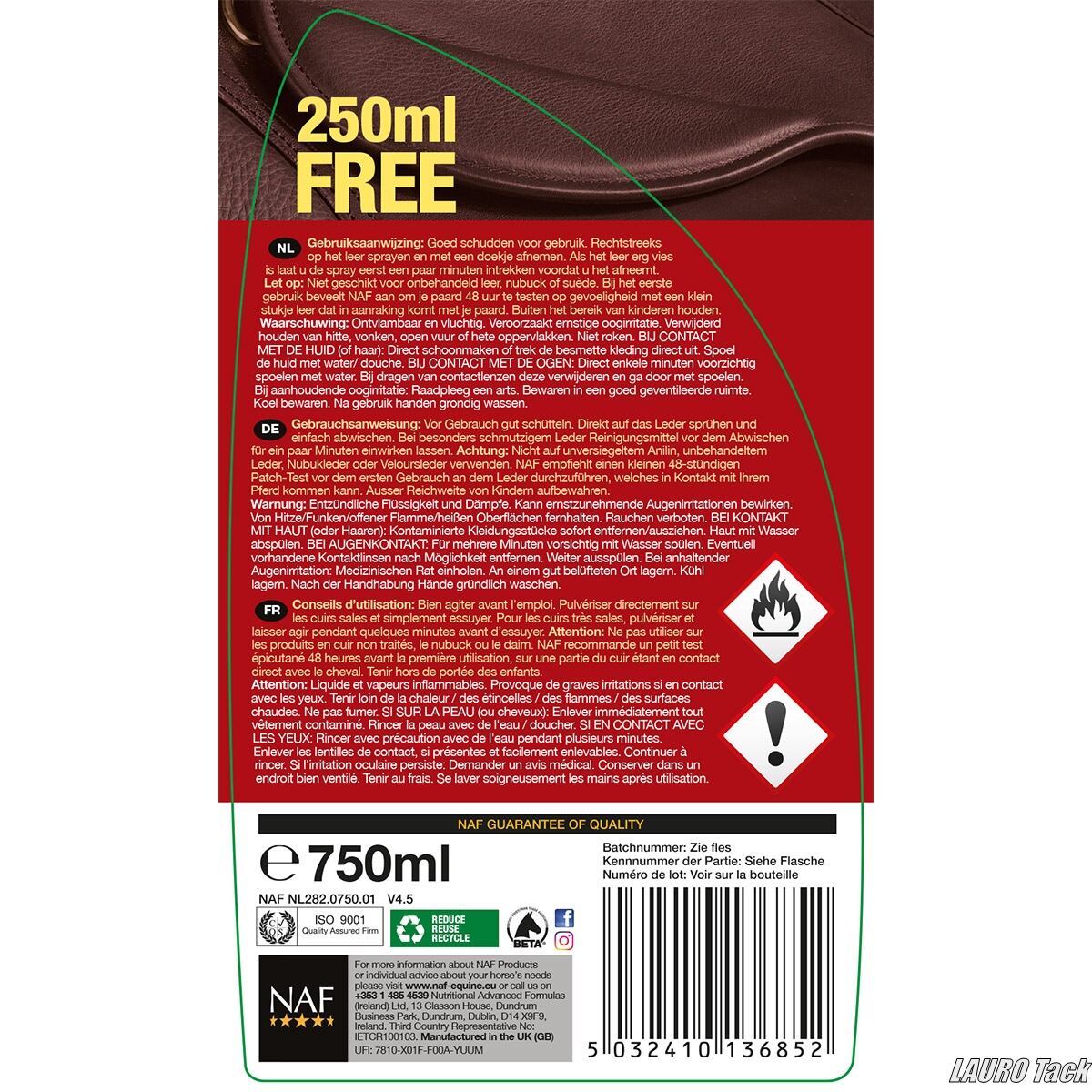 NAFの革用クリーナースプレー。シュッと吹きかければ、馬具の汚れを手軽に落とせて速乾性も抜群。毎日のちょっとしたお手入れに便利なアイテムです。
