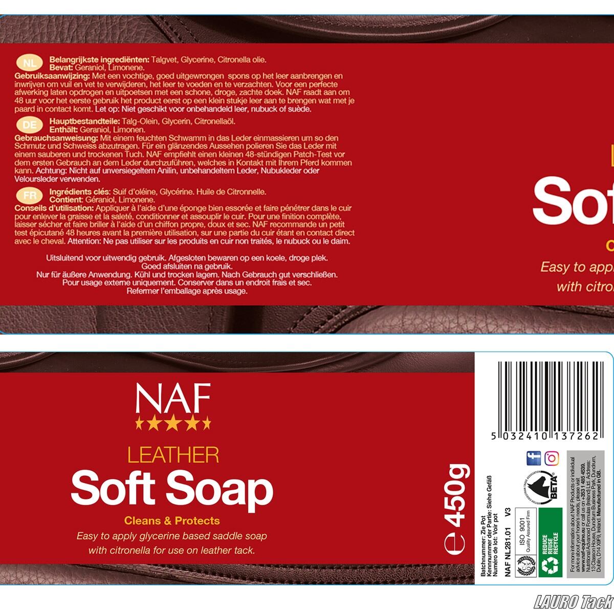 NAFのレザーソフトソープ。優しい処方で革を洗浄しながら栄養を与え、使いやすいクリーム状で馬具をきれいに保ちます。