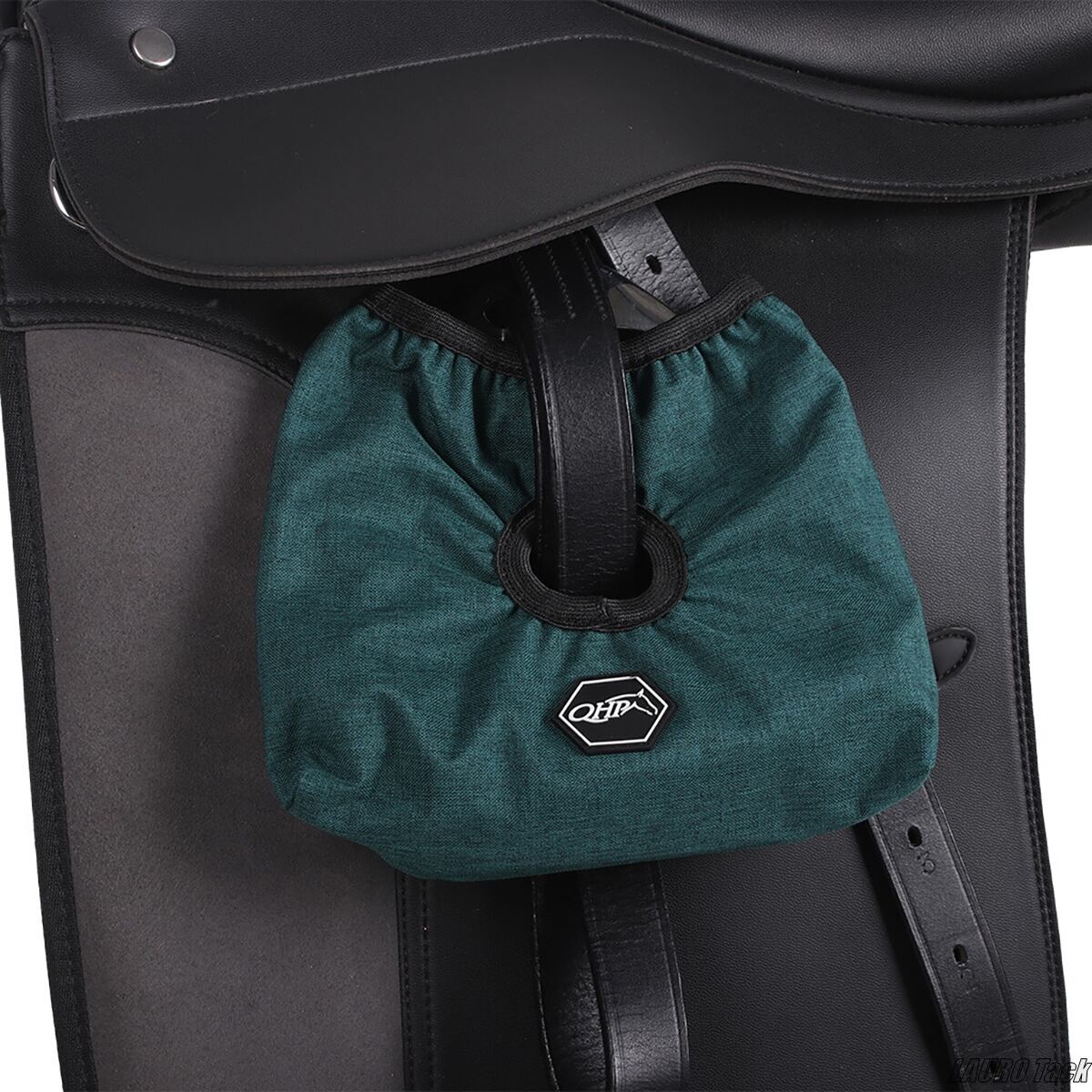 QHPの鐙カバー(ダークグリーン)。丈夫なポリエステル製で、フリース裏地が鞍を優しくカバーします。上部のゴムでフィット感抜群、中央には鐙革用の穴つき。落ち着いたグリーンカラーが大人っぽく、ペア販売。素材は100%ポリエステルです。