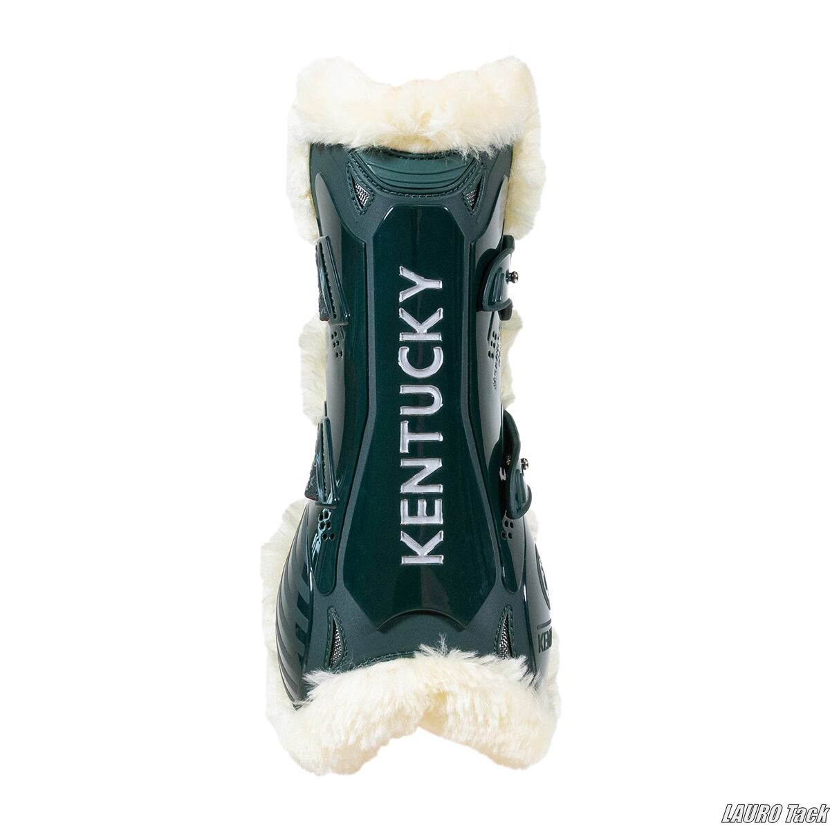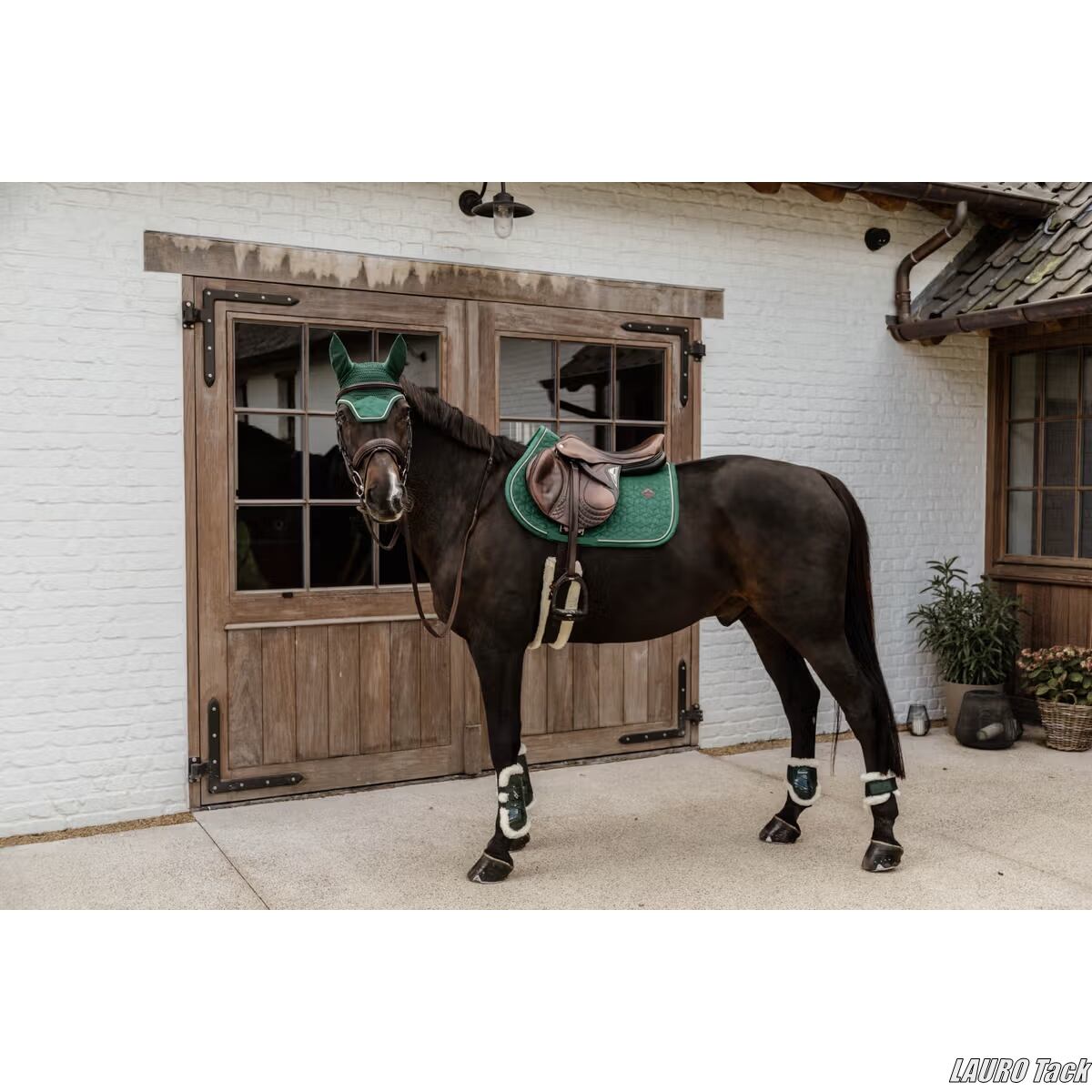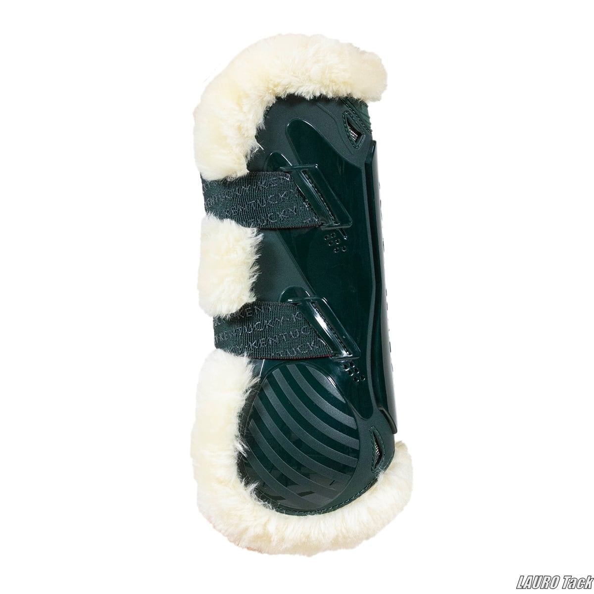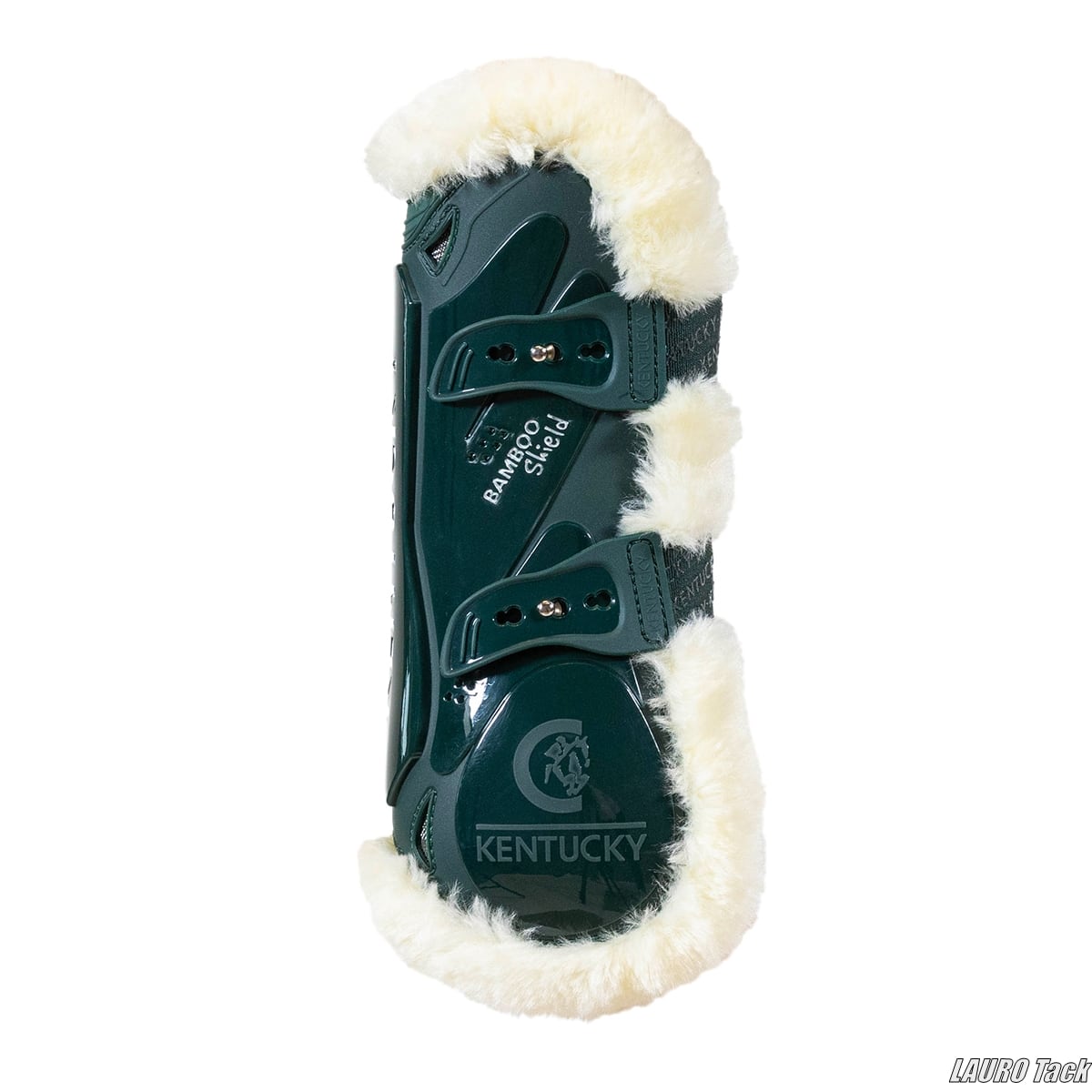 Kentuckyの前肢用ブーツ(ダークグリーン・人工ボア×竹ファイバー仕様)は、最新技術を取り入れた耐久性の高いモデルです。丈夫な保護カバーに通気口を備え、さらに腱部分には竹製シールドを配置して衝撃をしっかりガード。内側は通気性の高い3Dスペーサー素材と柔らかな人工ボアを組み合わせ、快適さと抗菌性を両立しています。軽量で動きやすく、伸縮素材を使ったクイックストラップで簡単に装着可能。Rico-testとRCT認証を受けた安心の設計です。