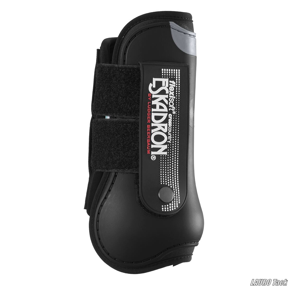 EskadronのFlexisoft Cross前肢用ブーツ(ブラック)は、クロスカントリー向けに設計された頑丈なモデルです。強度のある保護カバーと柔らかな裏地を組み合わせ、激しい運動でも安心。通気構造で熱を逃がし、ベルクロストラップでしっかり固定できます。クロスカントリー競技での信頼性を高めたデザインです。