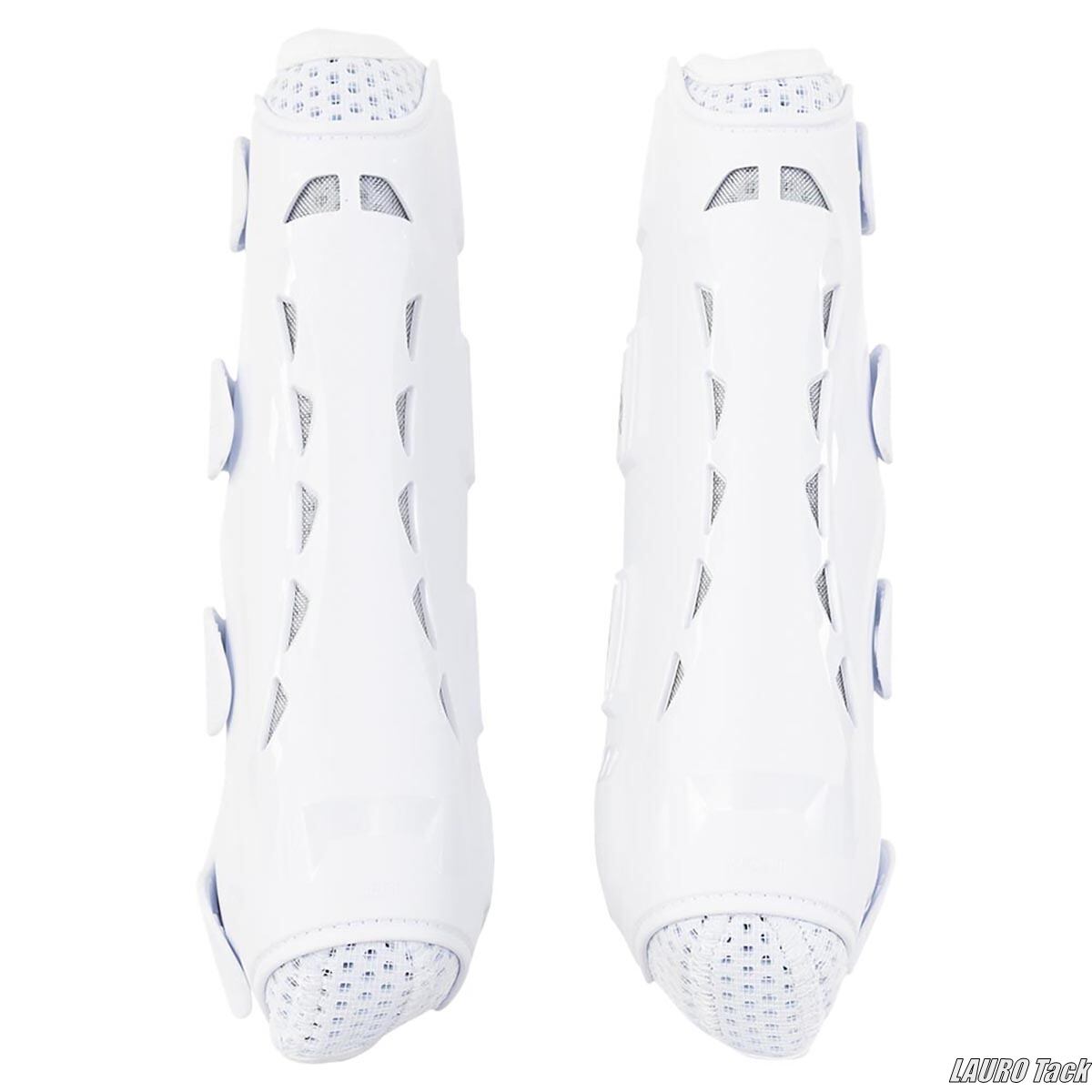 BRのCountryTech前肢用ブーツ(ホワイト)は、ラグジュアリーラインのハイエンドモデルです。保護カバーに補強素材を加え、耐久性と安全性を高めています。内側には通気性と吸湿性に優れたAirflowフォームを採用し、熱や湿気を効率的に逃がします。クイックストラップで安定した装着が可能で、洗濯機で洗える扱いやすさも魅力です。