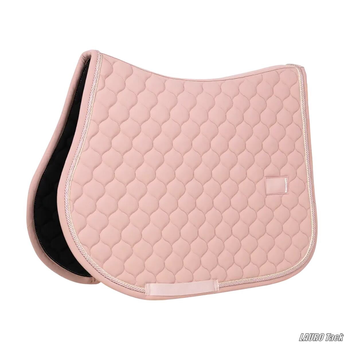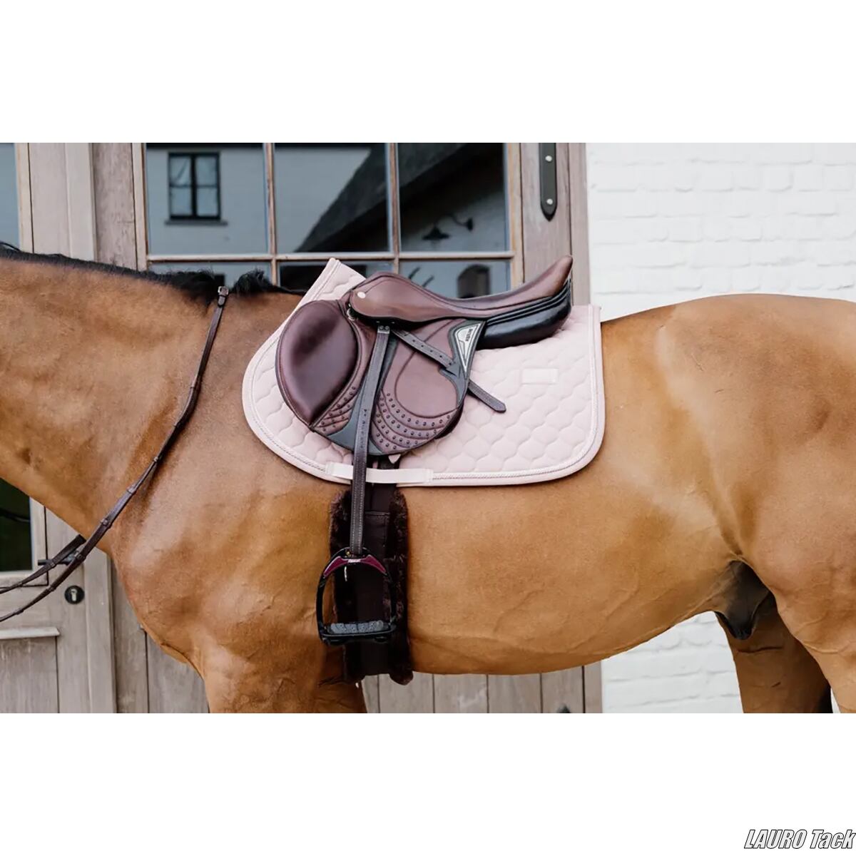 Kentuckyの丸型キルティングゼッケン(ミッドピンク)は、丸模様のキルティングとブランドロゴワッペンが特徴の華やかなモデルで、厚みのある作りが衝撃をやわらげ、吸湿性と通気性も確保しています。鮮やかなピンクカラーが馬体を明るく引き立て、障害競技でも普段の騎乗でも存在感を発揮します。