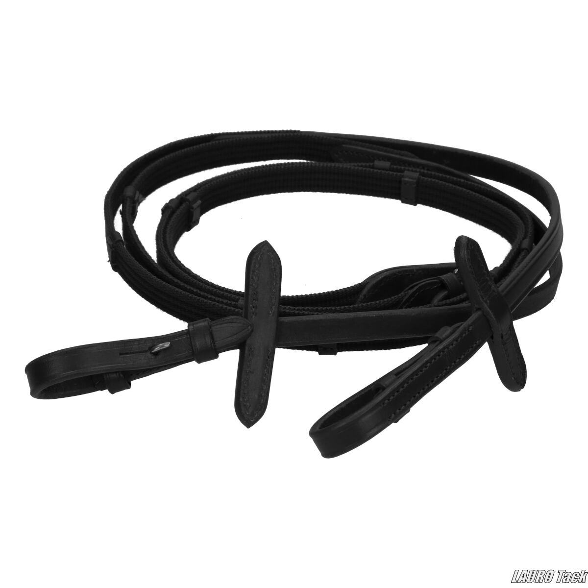 障害飛越用に設計された手綱で、滑りにくく操作性に優れています。強度の高い作りで安心して使え、ブラックのカラーが馬具全体を引き締め、競技でのパフォーマンスを支えます。