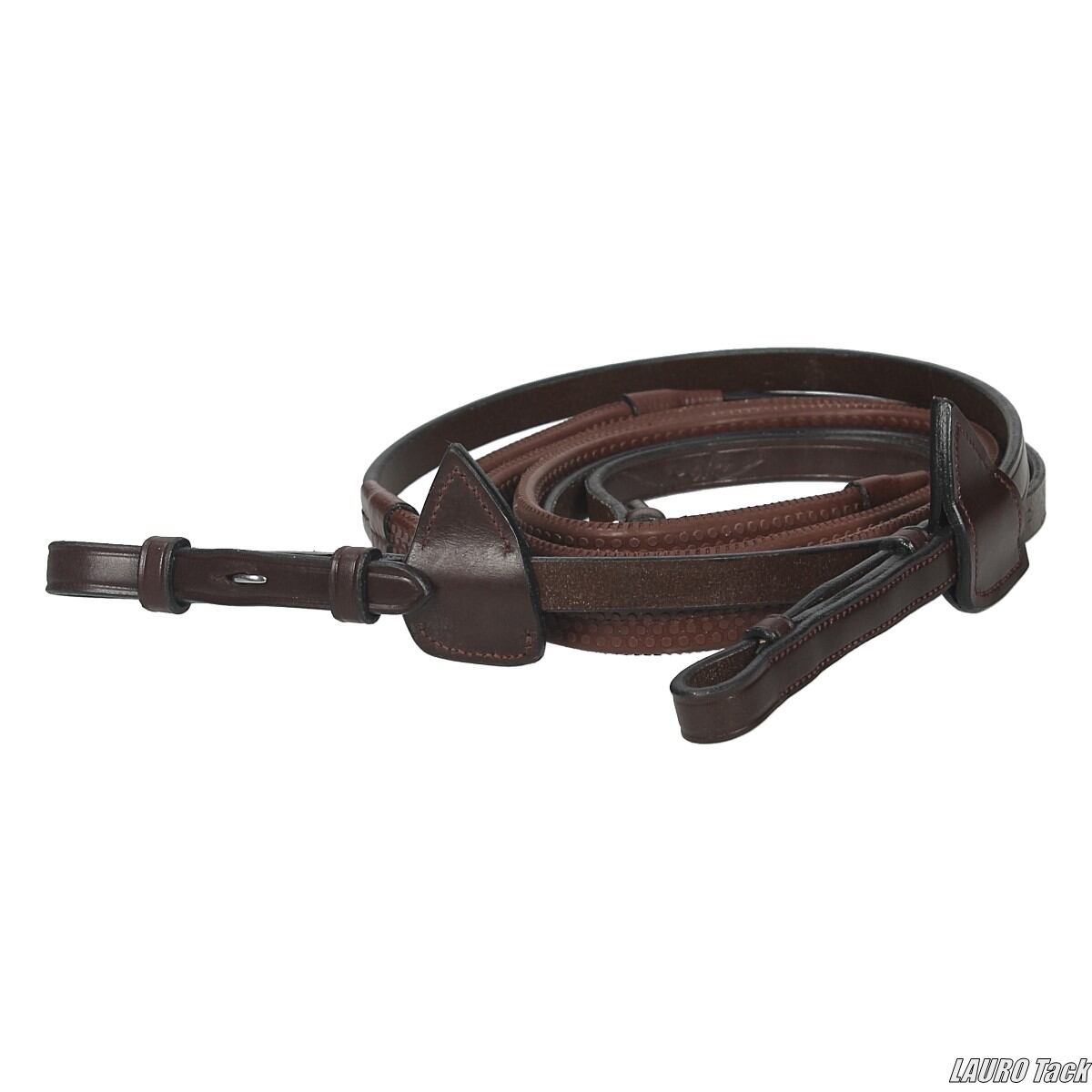 ブラウンのDy’on NECラバー手綱は、柔軟性と耐久性を兼ね備えており、使い込むほどに馴染む質感が魅力です。滑りにくく操作性に優れており、普段のレッスンや競技に適しています。