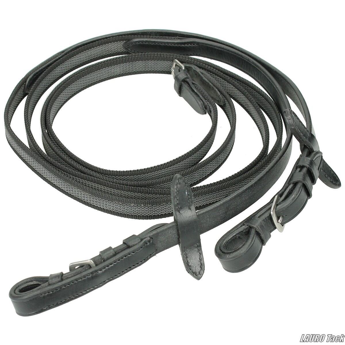 ラバー素材を採用したブラックの手綱は、滑りにくさと握りやすさを両立し、安定した操作を可能にします。普段のレッスンから競技まで安心して使用でき、丈夫で長く使える設計です。