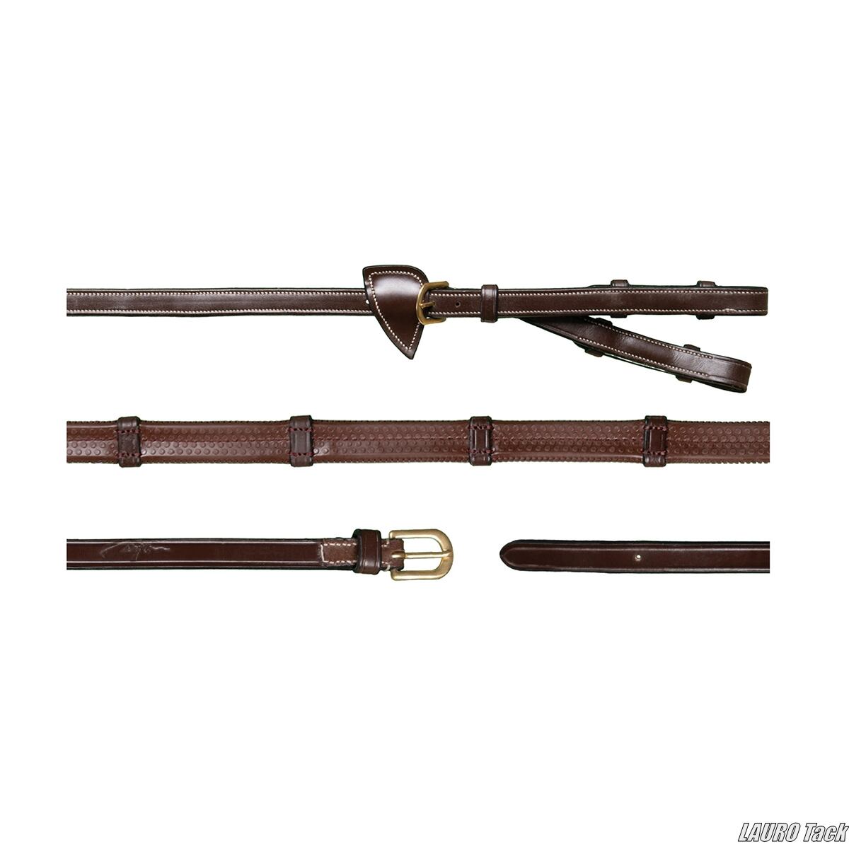 Dy’onのDコレクション手綱は幅1/2インチ(約13mm)のスリムタイプで、ペラムビットに合わせて使える設計です。ブラウンレザーにストッパーを備え、ラバー素材の滑りにくさで安定した手綱操作を実現します。