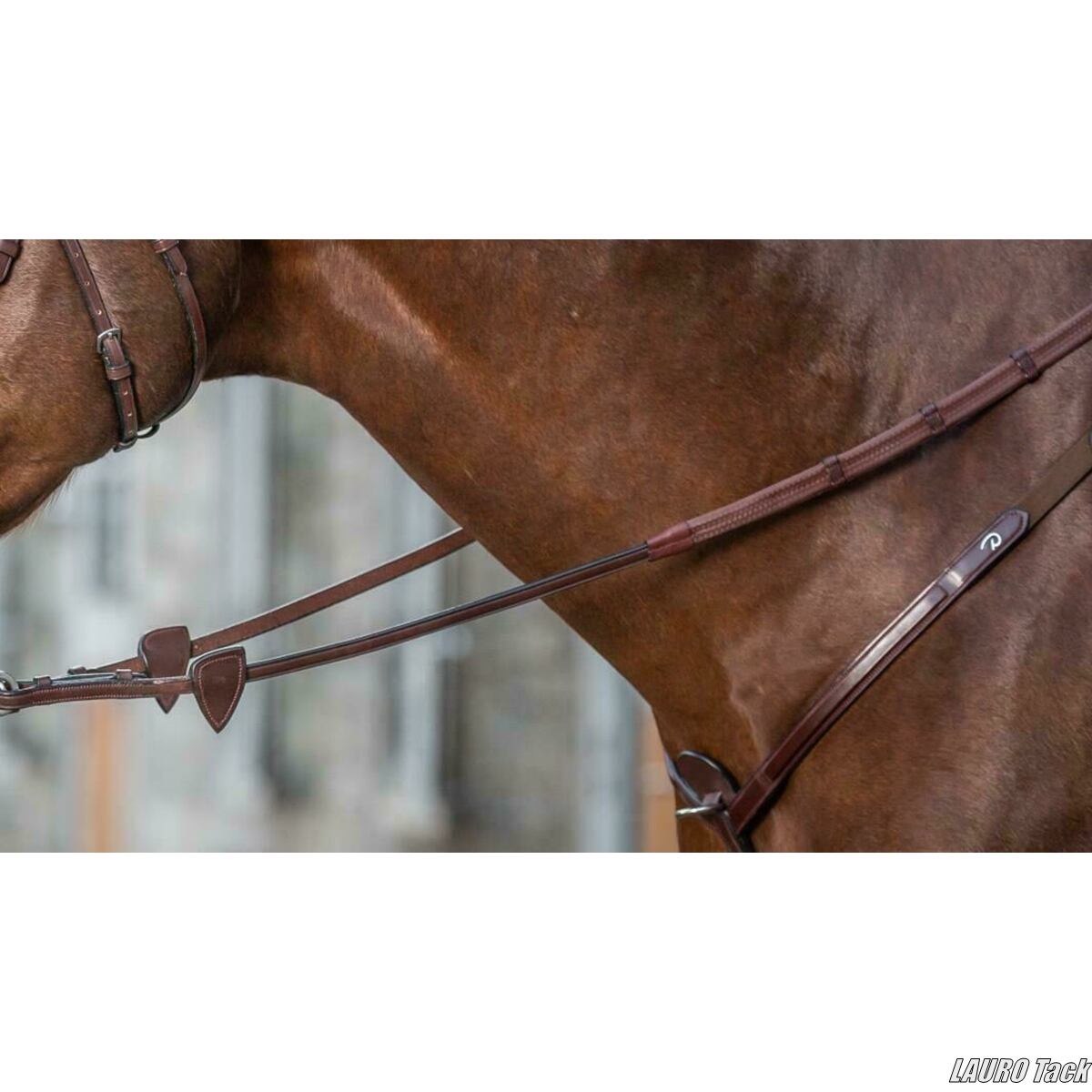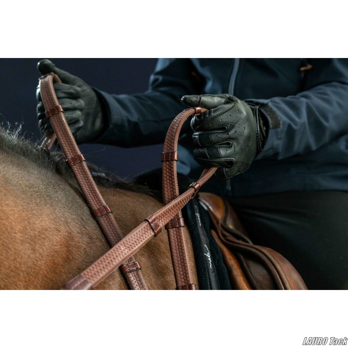 Dy’onのニューイングリッシュコレクションに属するストッパー付きのラバー仕様の手綱で、一定の長さを保ちやすく、正しい手綱操作を自然にサポートします。耐久性と快適さを兼ね備え、長時間の騎乗にも適しています。ブラウンのクラシックなトーンが落ち着きと高級感をもたらします。