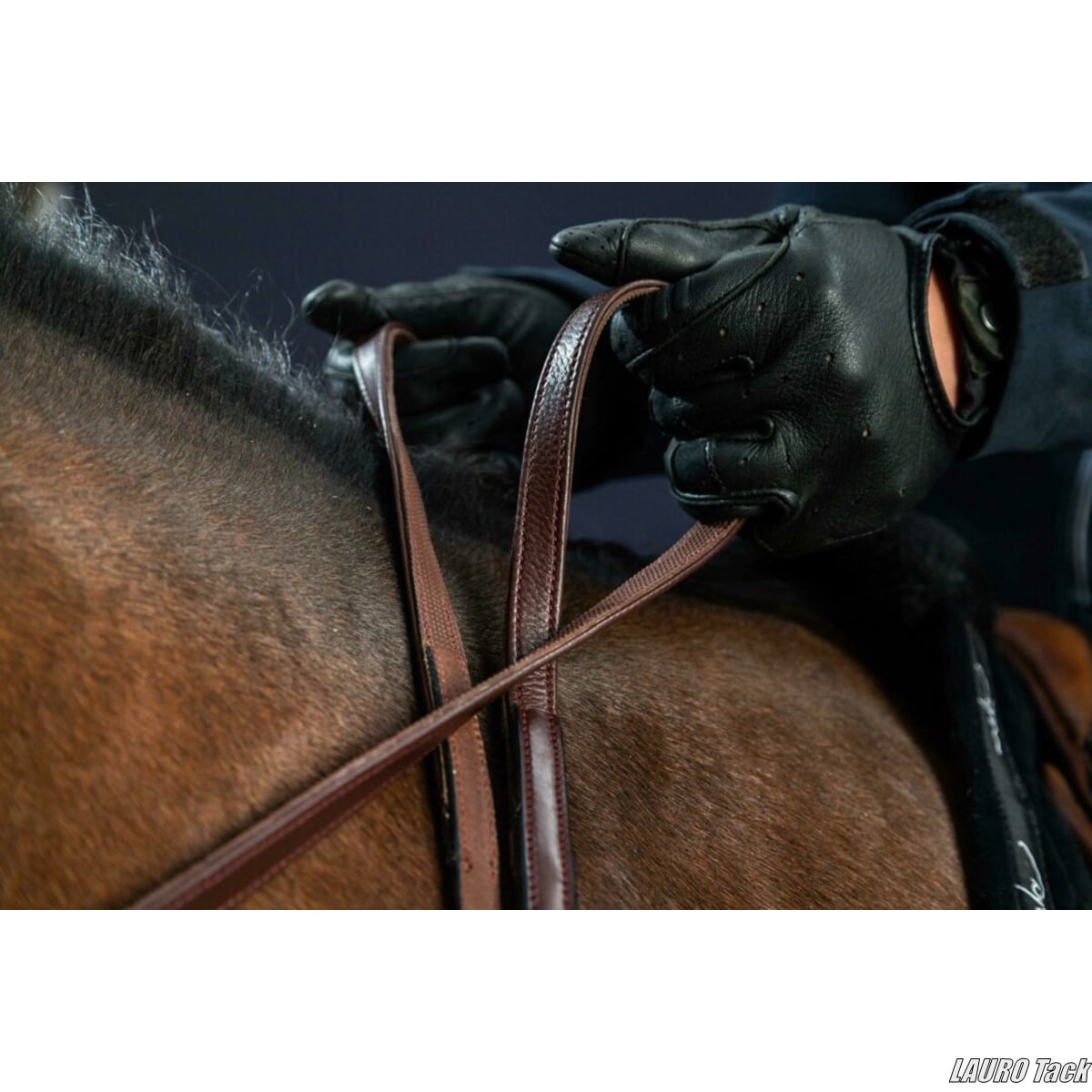 Dy’onのニューイングリッシュコレクションに属するラバー仕様の手綱で、幅1/2インチ(約13mm)のスリム設計が扱いやすさを高めています。繊細な指示を馬に伝えやすく、レッスンや競技で正確な操作を可能にします。ブラウンの色合いがクラシックな装備とよく馴染み、落ち着きを演出します。