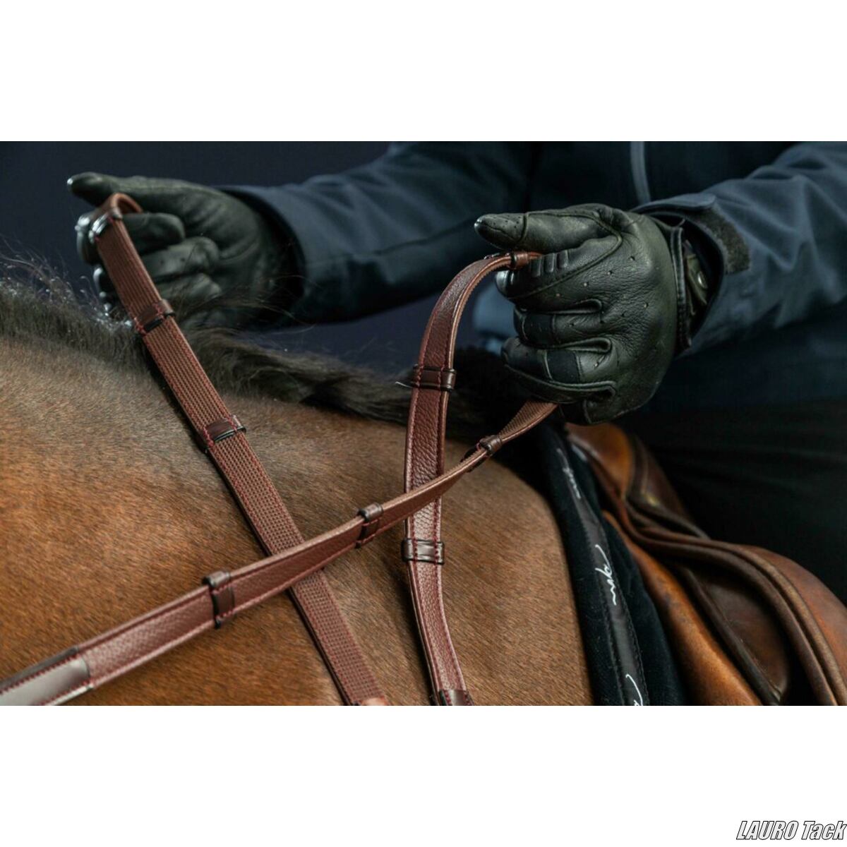 Dy’onのドレッサージュコレクションに属するストッパー付きのラバー仕様の手綱で、幅5/8インチ(約16mm)の厚みが快適な操作性を生み出します。ストッパーが均一な手綱さばきを支え、レッスンから競技まで頼れる一本です。ブラウンの落ち着いた色合いが上品さを引き立てます。