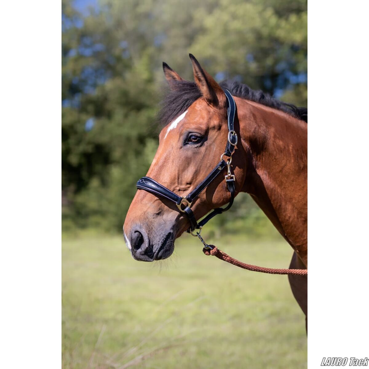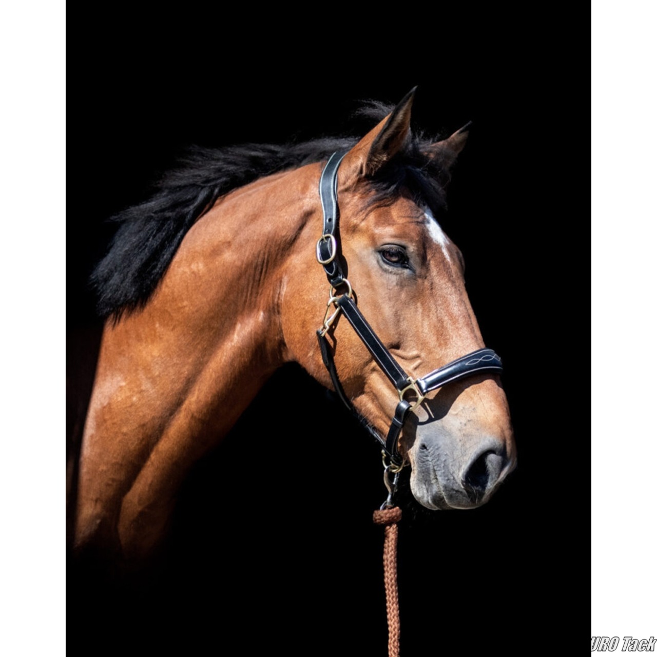 Dy’onのDコレクションの無口。2in1の構造で通常の無口としてもグルーミング用としても使用可能。解剖学形状で柔らかい鼻革が馬に快適さを提供し、取り外し可能な喉革で手入れもしやすいデザインです。ブラックはシンプルでエレガントな雰囲気を演出します。