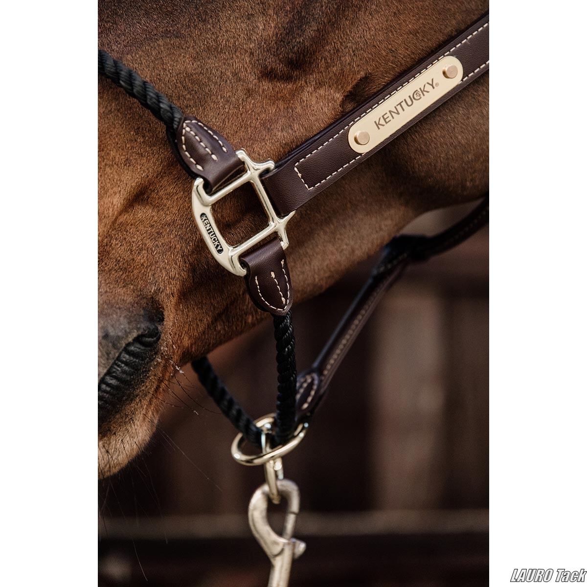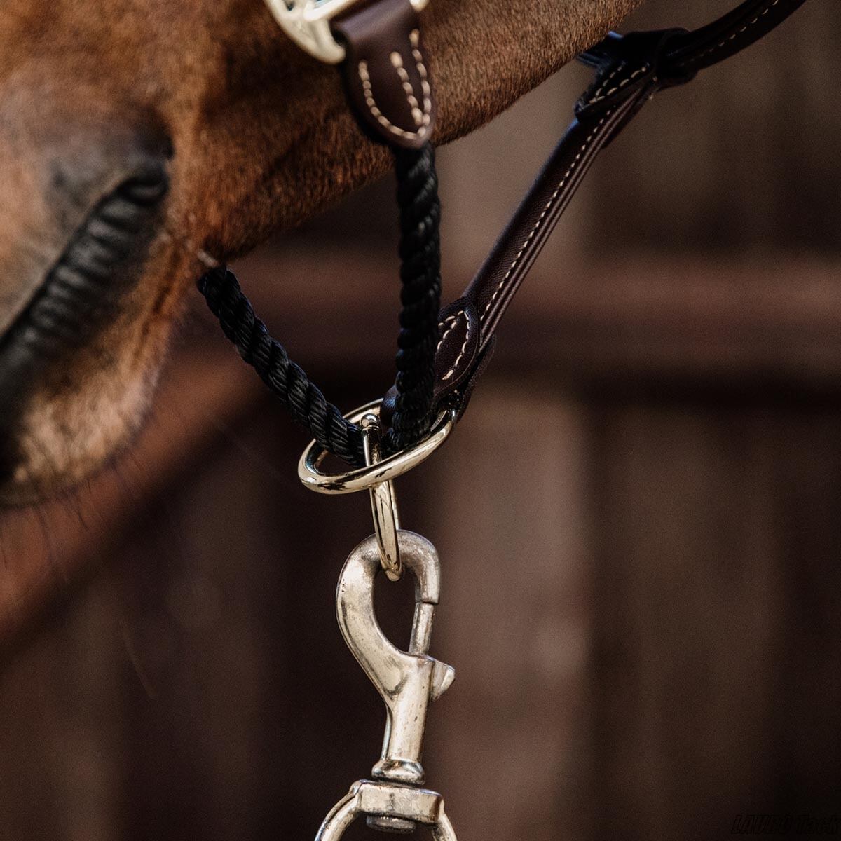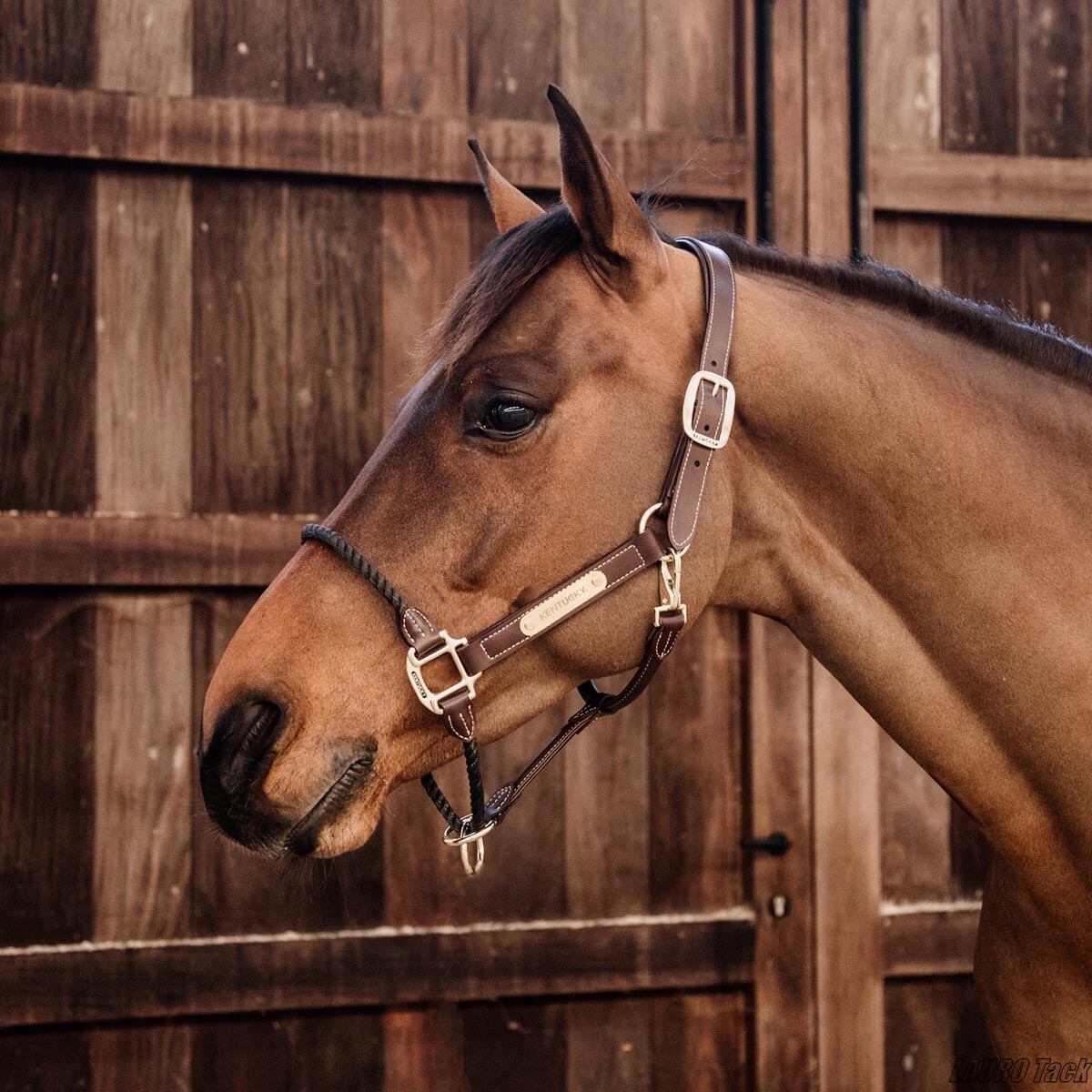 Kentuckyのロープ無口。シンプルで丈夫なロープを使い、普段の管理や放牧に便利。ブラウンはナチュラルで落ち着いた雰囲気を与えます。