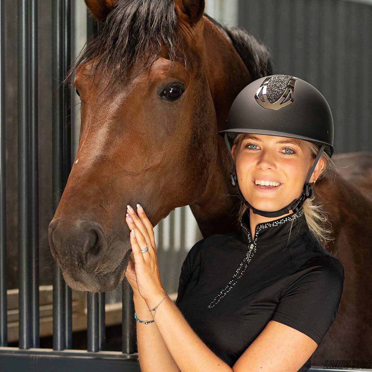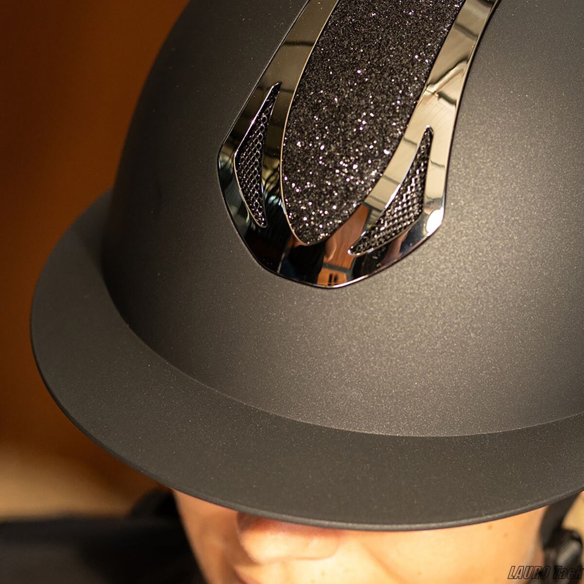 スパークリング加工が施されたブラックのセーフティーヘルメットです。きらめくデザインが目を引きながらも、安全性と快適性をしっかり両立。華やかなスタイルを求めるライダーにぴったりのアイテムです。