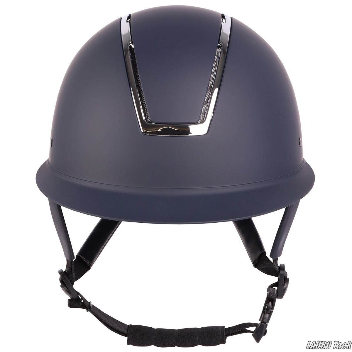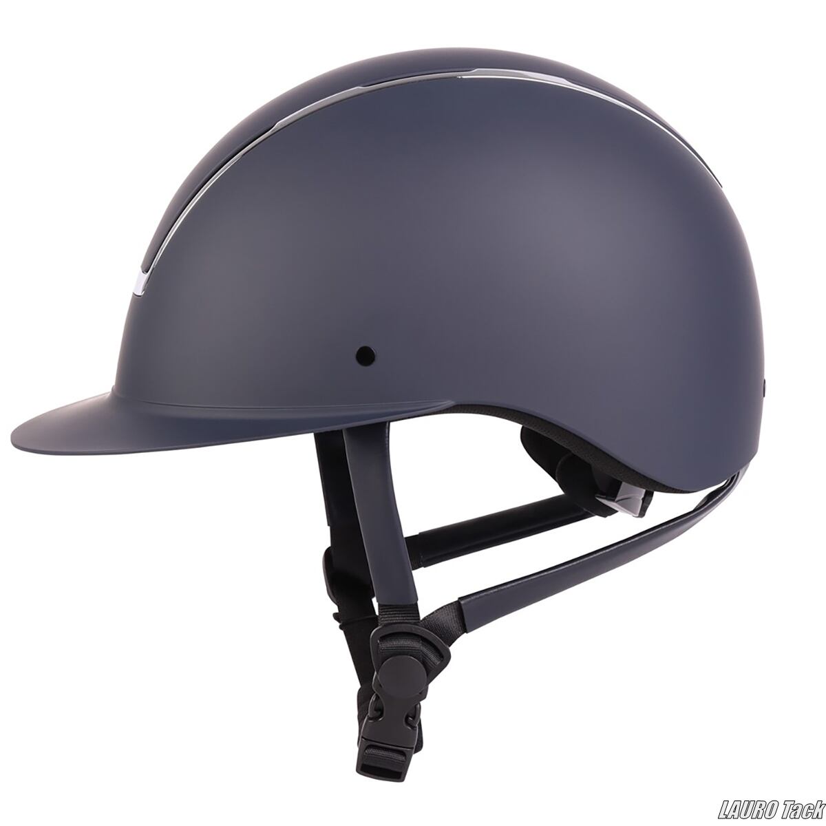 深いダークブルーの外装にシルバーのインレイをあしらった高級感あるデザイン。広めのバイザーで日差しや雨から守り、VG1規格対応で安心。複数の通気孔で快適に過ごせ、後部のダイヤルでサイズ調整も簡単。取り外して洗えるインナーを備えています。
