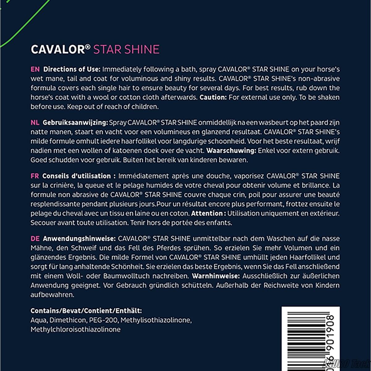 Cavalor Star Shineは、毛並みとたてがみを美しく整えるスプレーです。静電気を防ぎ、長時間サラサラとした輝きをキープします。ブラッシングの滑りを良くし、絡まりを防止。ショーや競技前のグルーミングに最適で、馬体を一層華やかに見せます。
