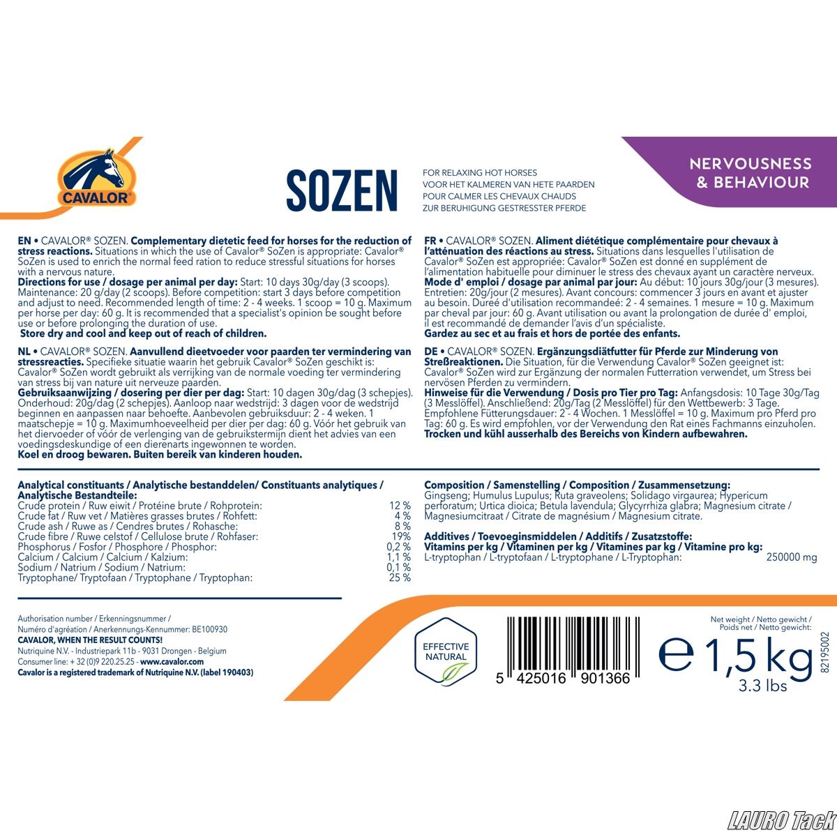 Cavalor Sozen(Cavalor)ストレスを感じやすい馬のために開発された天然由来のリラックスサプリメントです。神経の興奮を抑え、落ち着きをもたらすハーブエキスを配合。競技前や輸送、環境の変化に伴う不安を軽減し、精神面からベストなパフォーマンスを引き出します。