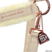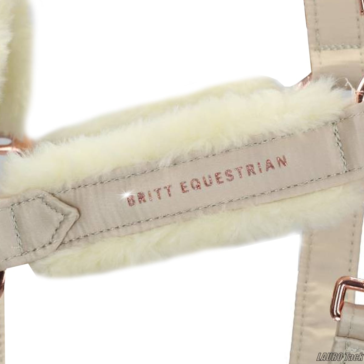 やわらかなボアをあしらった無口とロープのセットです。頭まわりと鼻まわりにクッションパッドが入り愛馬にやさしい着け心地です。長さを調整できるベルトでぴったりフィット。金具には丈夫で光沢のある素材を使用しロゴ入りの装飾が上品な印象を与えます。きらめく縁取りが美しくお出かけ用にもおすすめのアイテムです。