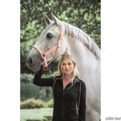 肌あたりのやさしいクッション素材を使った無口とロープのセットです。頭や鼻の部分にやわらかなパッドが入り長時間の着用でも快適に過ごせます。両側で長さを調整できるベルト付きでしっかりフィット。金具には丈夫で上品な光沢のある素材を採用。きらめく縁取りが可愛らしい印象を添えます。太めのロープは持ちやすく日常使いに最適です。