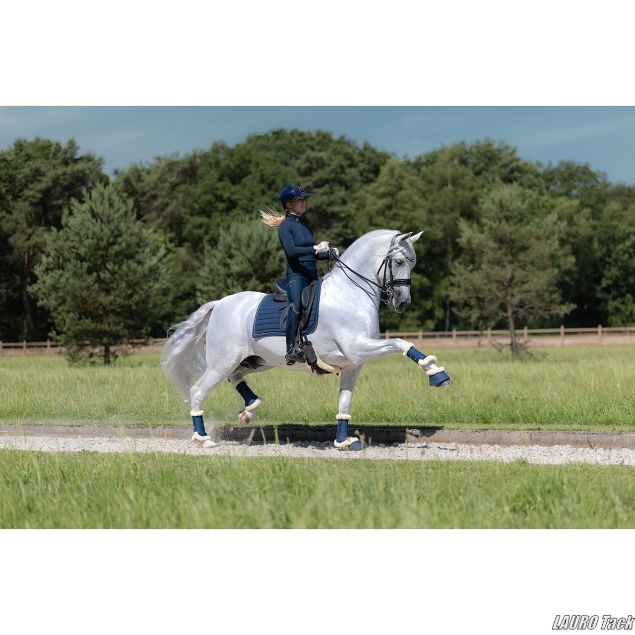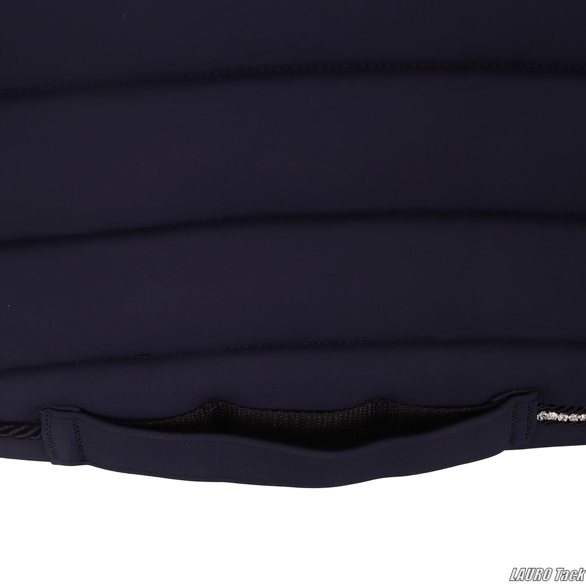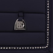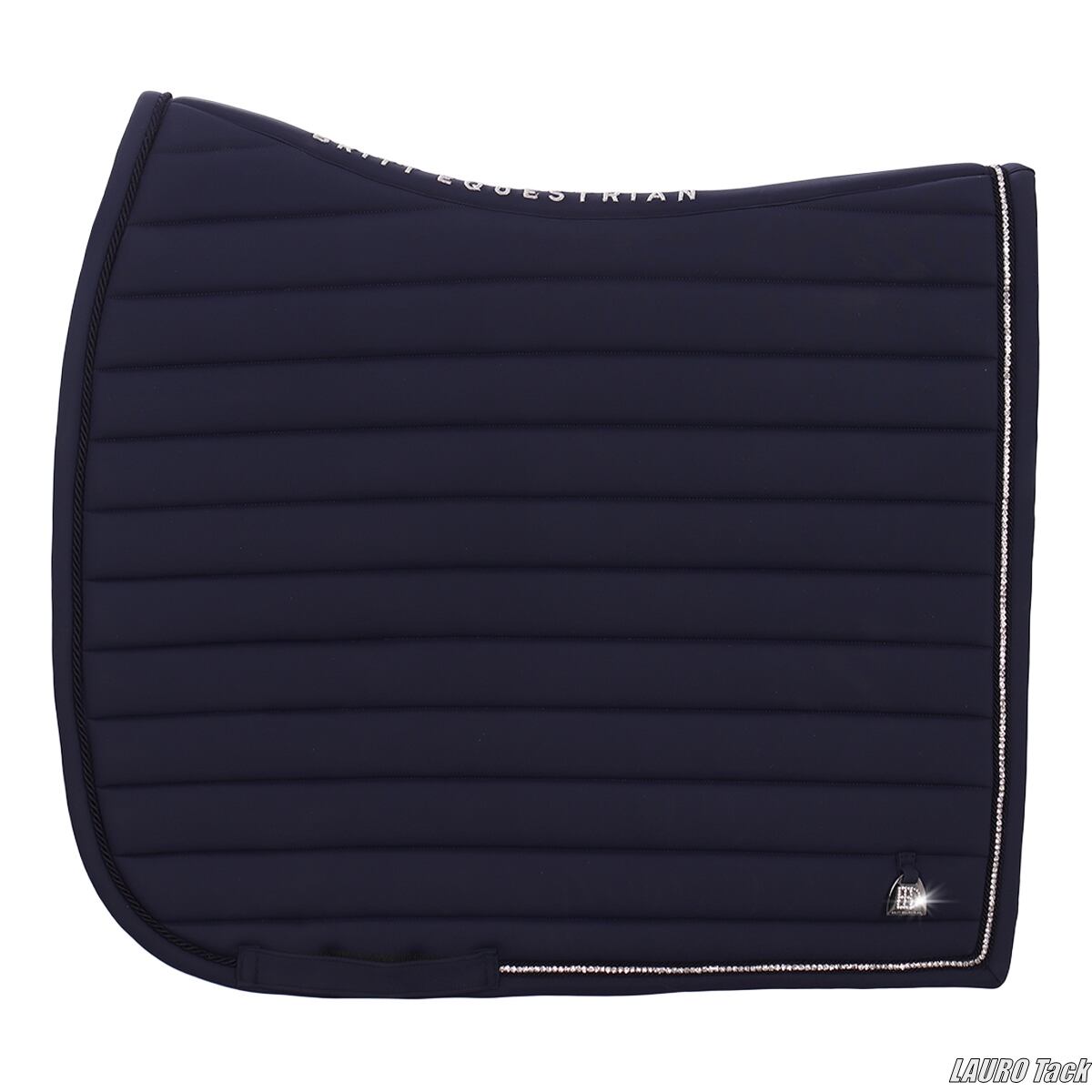 快適な着け心地と美しいデザインを両立した馬場用ゼッケンです。吸湿性のある裏地と厚みのあるクッションが長時間の騎乗でも馬の背中をやさしく守ります。身体に沿う形状でフィット感が高くずれにくい構造です。装飾コードとストーンが上品に輝き落ち着いたネイビーが高級感を引き立てます。