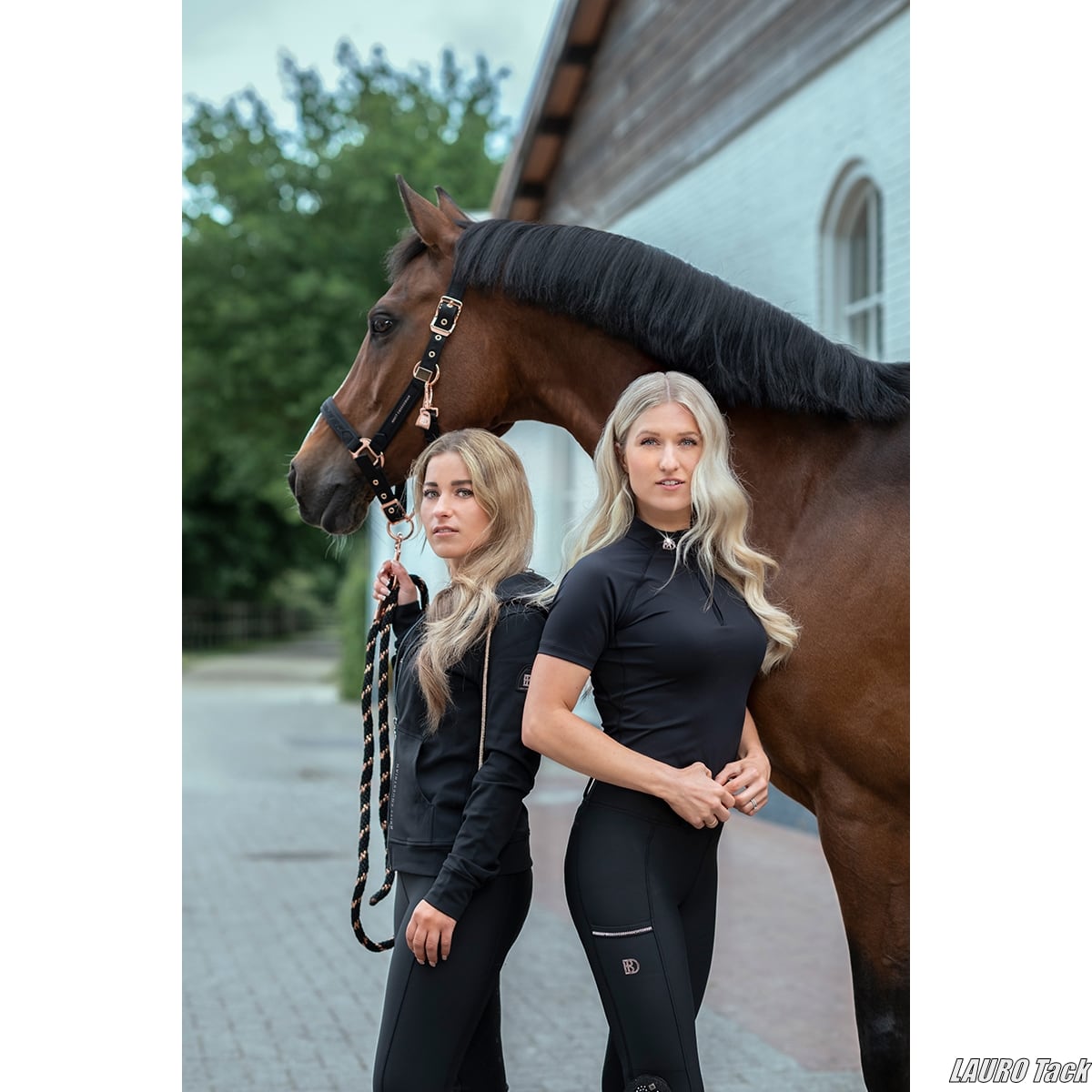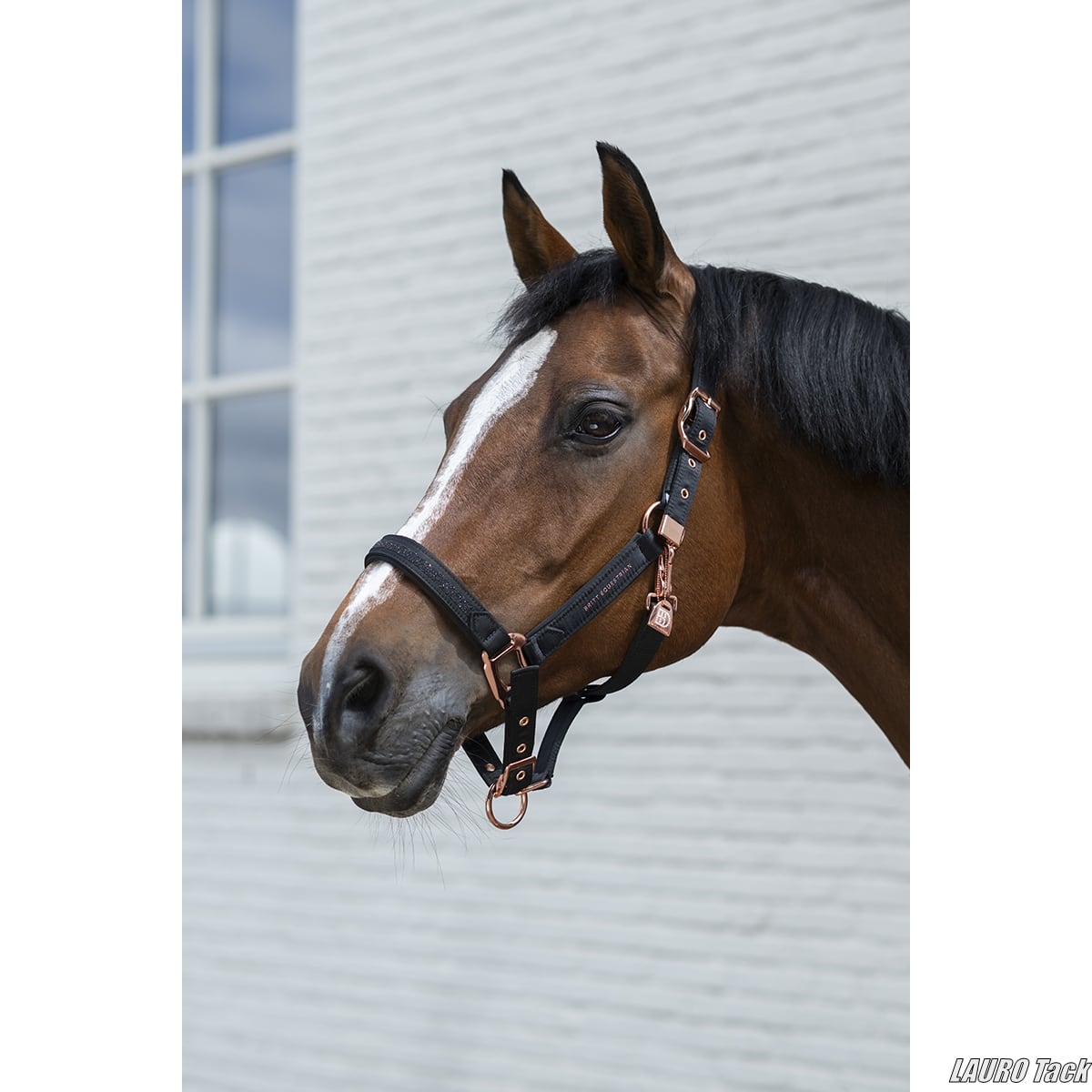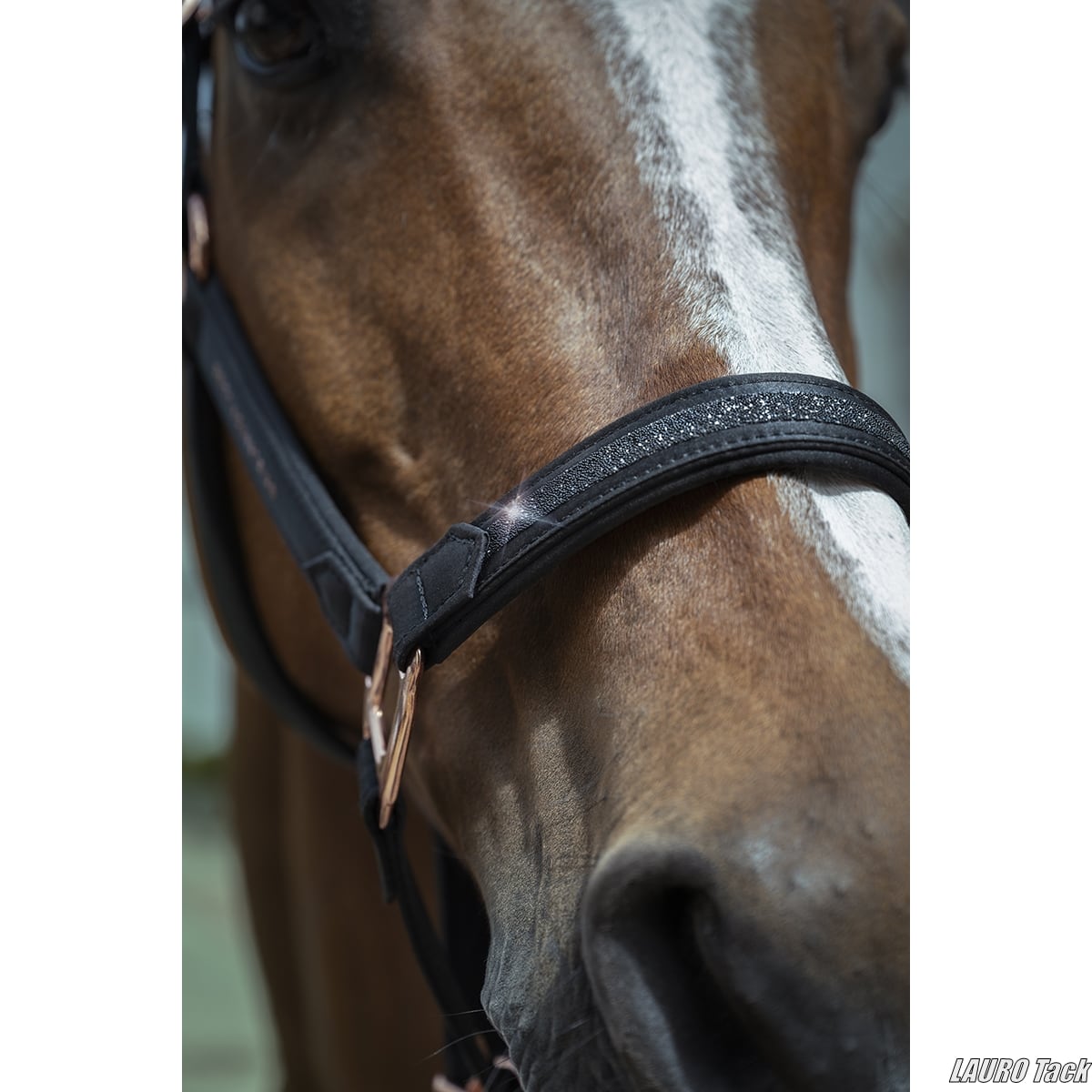 やわらかなクッションパッドを使った無口とロープのセットです。頭や鼻の部分をやさしく包み込み快適な着け心地を保ちます。両側のベルトでサイズ調整ができ愛馬にぴったりフィット。金具は丈夫で光沢がありノーズ部分のきらめく縁取りが上品な印象を与えます。黒の落ち着いたデザインで季節を問わず使いやすいアイテムです。