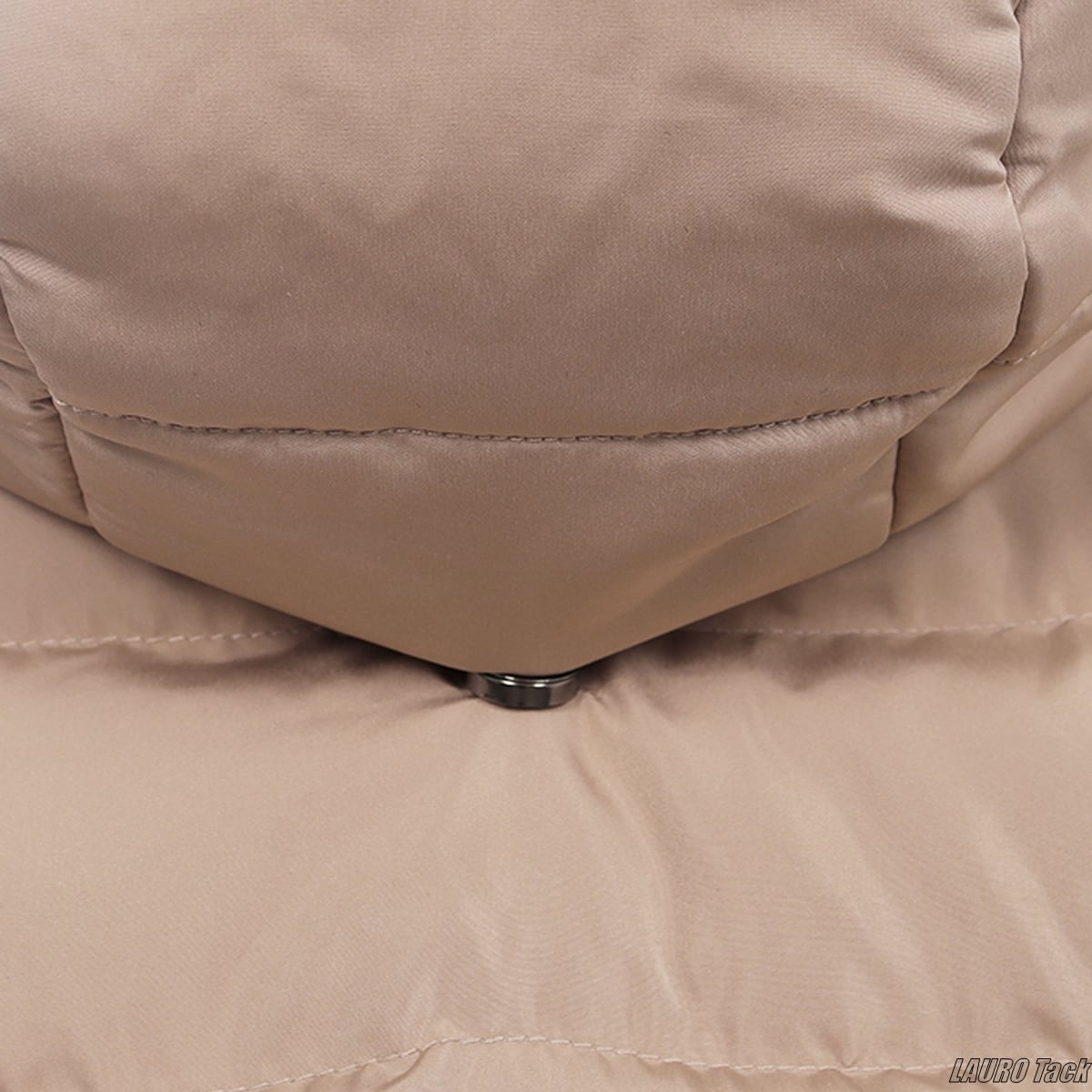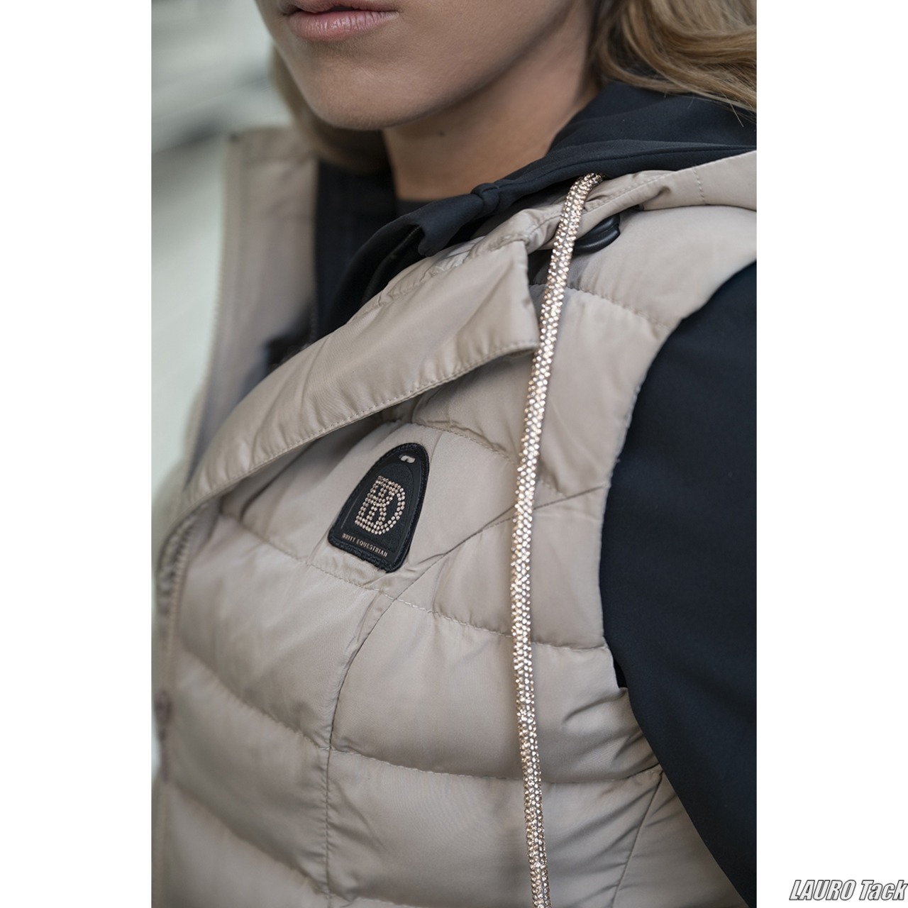 冬のコレクションらしい上品な印象のボディウォーマーです。軽くて動きやすくエレガントなキルティングが体に沿って美しいラインを描きます。内側には防風仕様の前立てを備えファスナーにはあごを守るカバーを装備しています。裾の内側にあるドローコードでフィット感を調整でき動いてもすっきりとしたシルエットを保ちます。背中でマグネット留めができるフードは見た目も洗練され左右の隠しポケットは小物の収納に便利です。胸元と前立てにはきらめくロゴの装飾が施され冬のレッスンや外出時のスタイルを華やかに引き立てます。